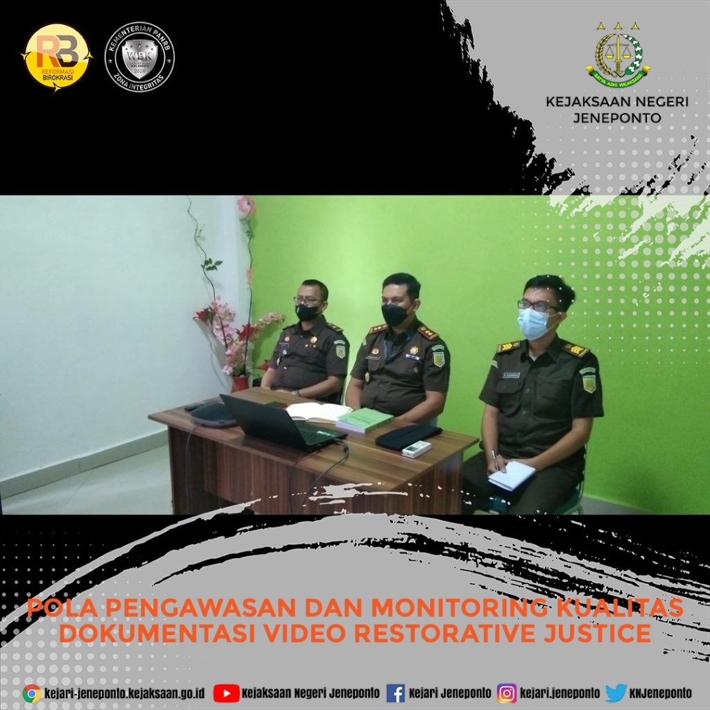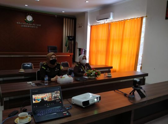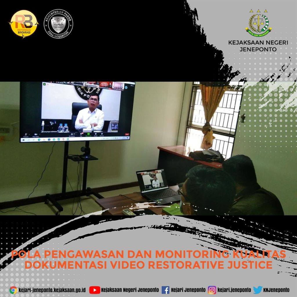 Kepala Kejaksaan Negeri Jeneponto,Kasi Pidum dan Staff Intel mengikuti Pengarahan Jaksa Agung Muda Tindak Pidana Umum tentang POLA PENGAWASAN DAN MONITORING KUALITAS DOKUMENTASI VIDEO RESTORATIVE JUSTICE melalui sarana Video Conference di Ruang Sidang Online Kejari Jeneponto dengan mematuhi protokol kesehatan