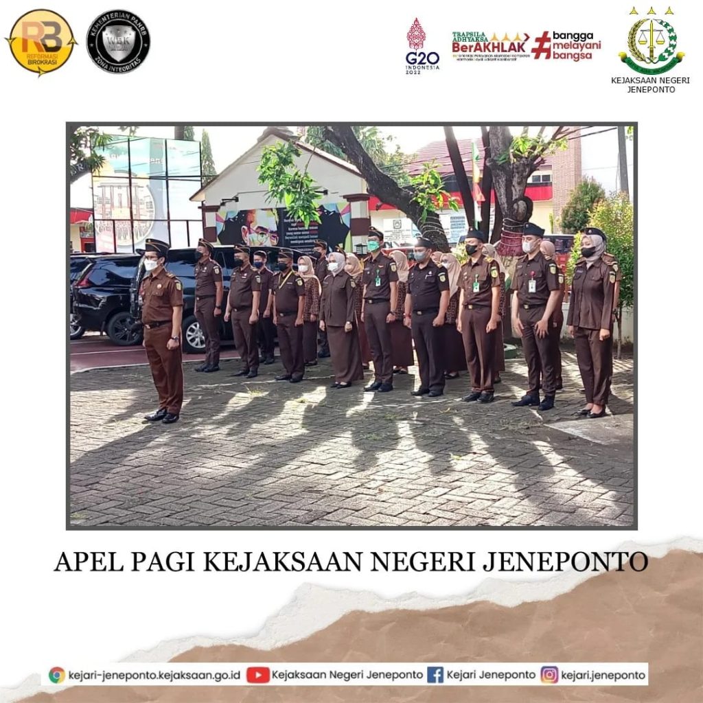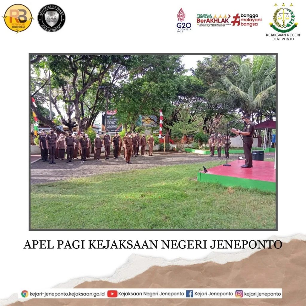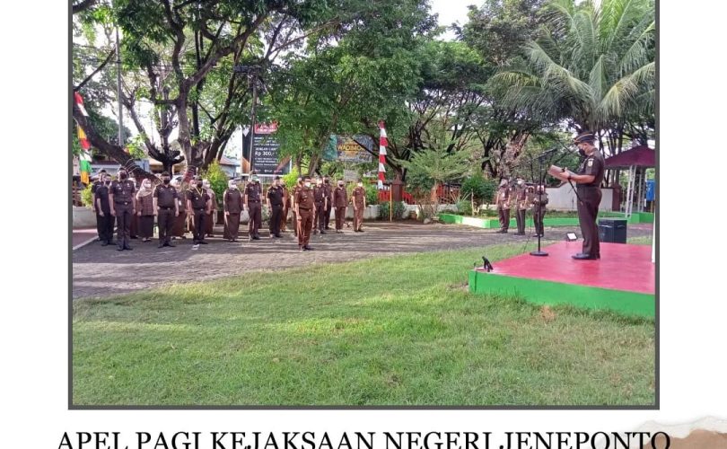 Kejaksaan Negeri Jeneponto melaksanakan Apel Pagi setelah cuti bersama Idul Fitri 1443 H. Apel tersebut dipimpin langsung oleh kepala Kejaksaan Negeri Jeneponto Bapak Susanto Gani, S.H dan diikuti oleh para Kasi, Jaksa Fungsional, Pegawai dan Pramubakti