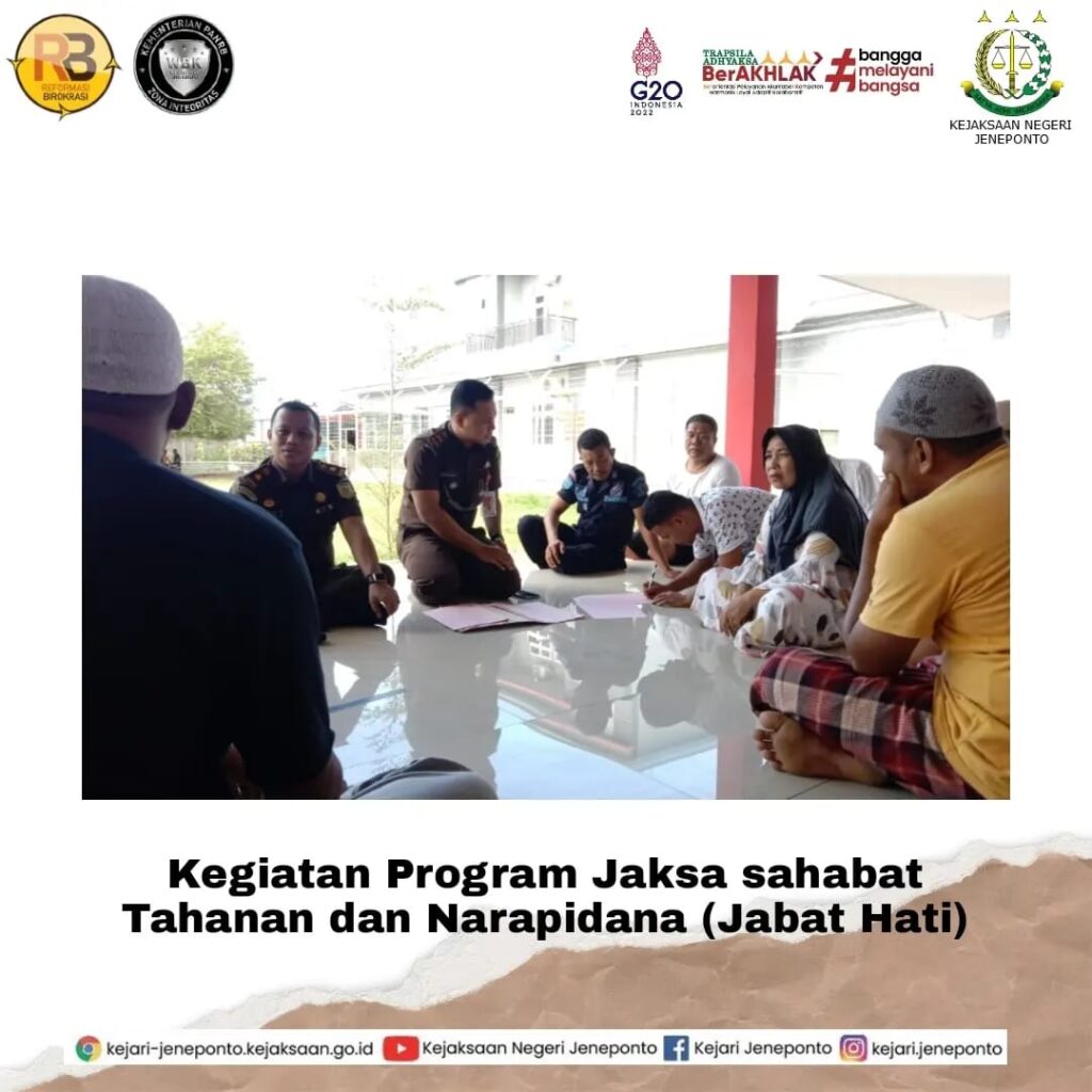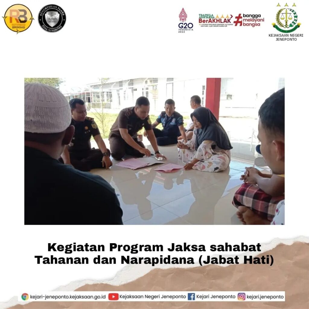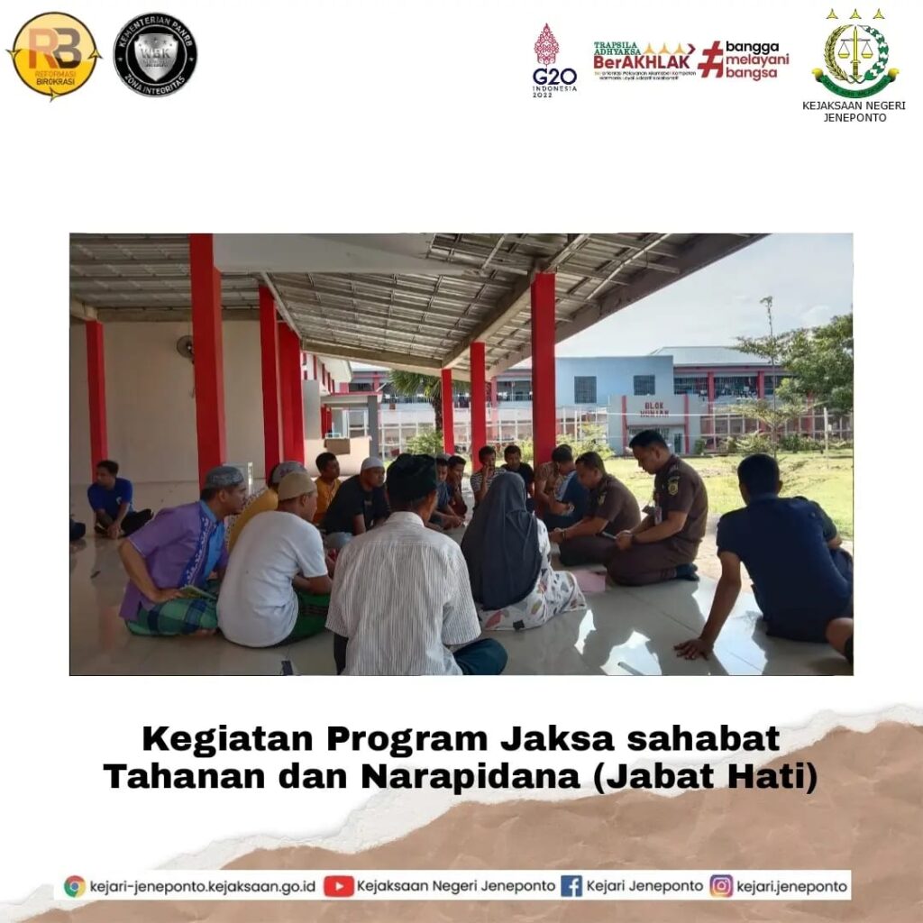 Kepala Seksi Tindak Pidana Umum melaksanakan kegiatan Program Jaksa sahabat Tahanan dan Narapidana ( Jabat Hati ) bertempat di Rutan Kelas IIB Jeneponto, Kegiatan Tersebut didampingi oleh kepala Rutan Kelas IIB Jeneponto dan dihadiri kurang lebih 30 Tahanan dan Narapidana, dalam kegiatan tersebut Kasi PIdum Kejari Jeneponto membahas tentang proses Alur Perkara sehingga tahanan dan Narapidana antusias dan aktif bertanya, selain kegiatan Jabat Hati , bidang Pidum juga melakukan eksekusi terhadap 5 orang Tahanan.