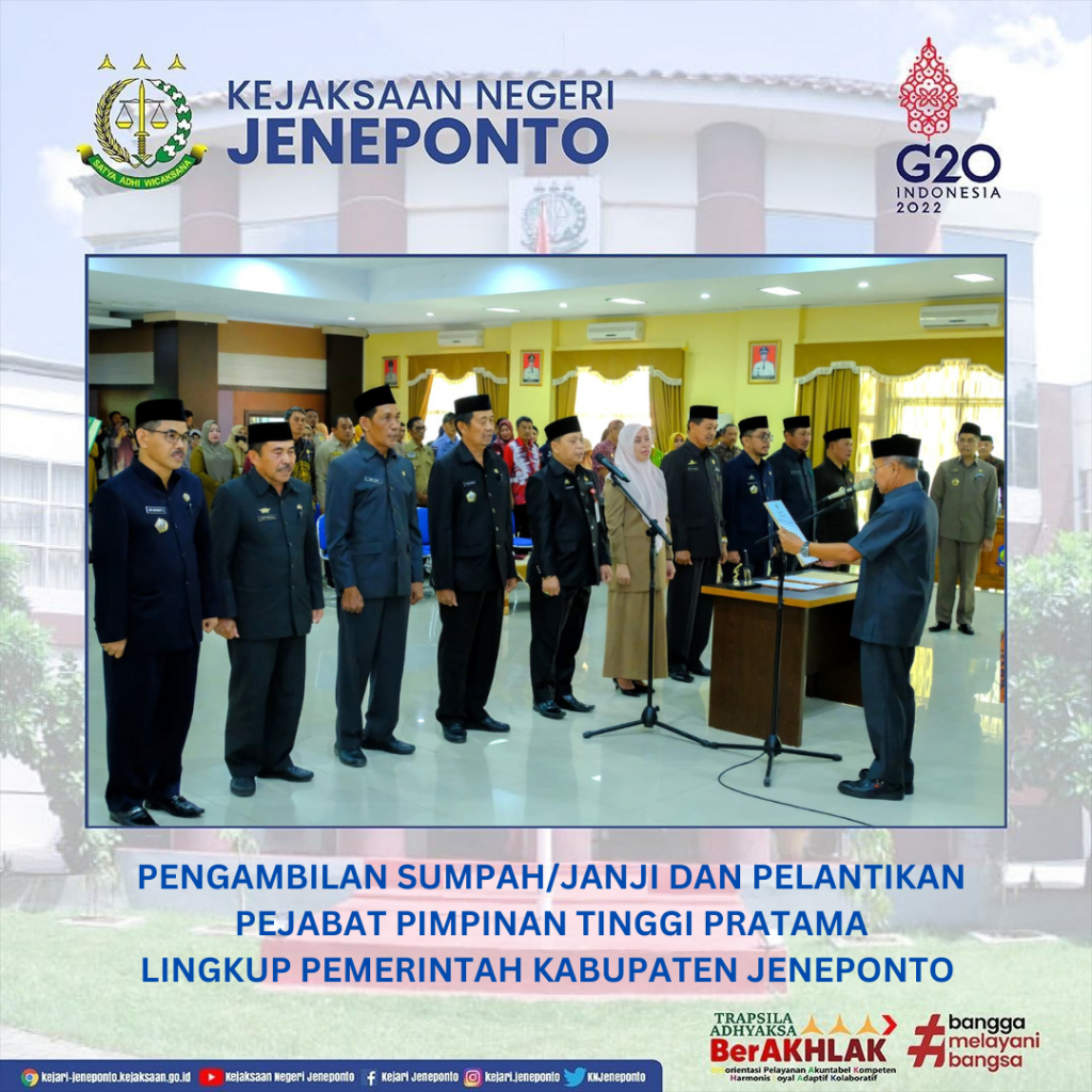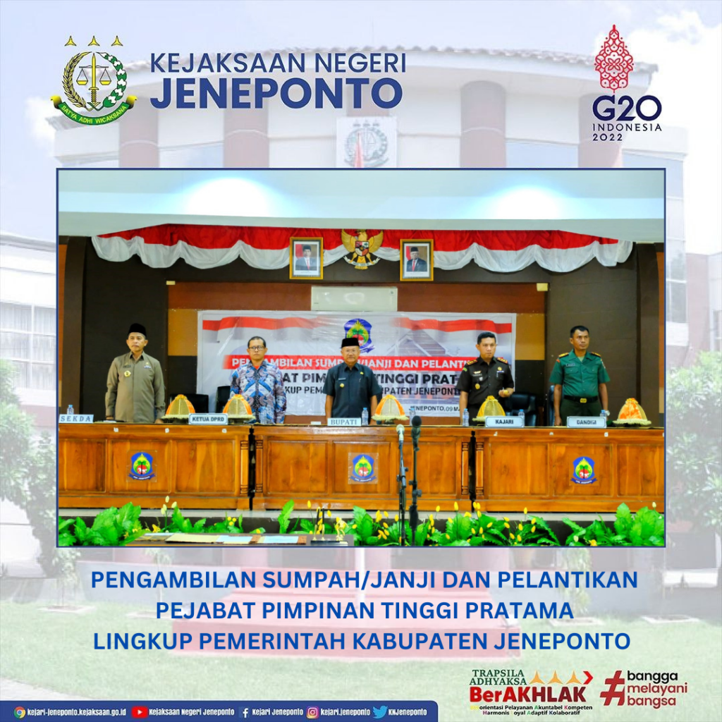 Kepala Kejaksaan Negeri Jeneponto menghadiri acara Pengambilan Sumpah/Janji Dan Pelantikan Pejabat Pimpinan Tinggi Pratama Lingkup Pemerintah Kabupaten Jeneponto bertempat di Ruang Pola Kantor Bupati Jeneponto.