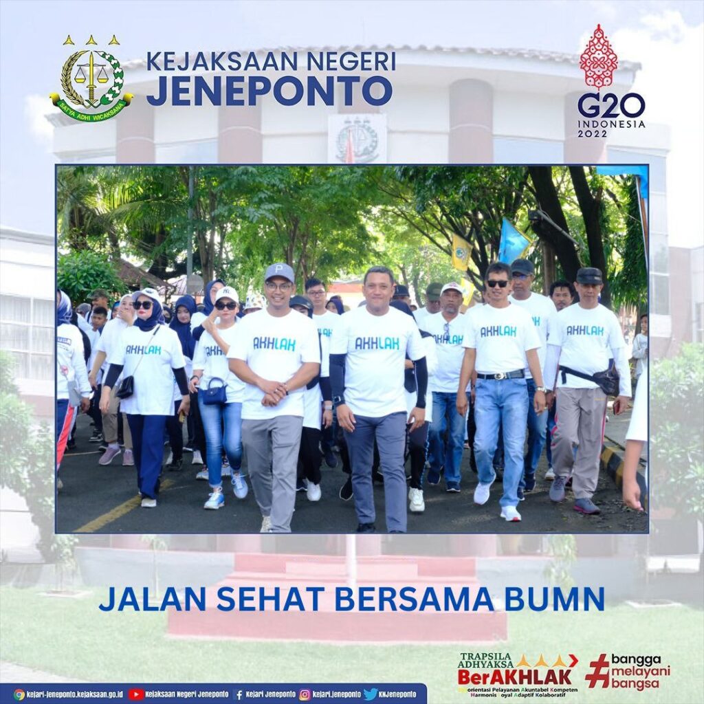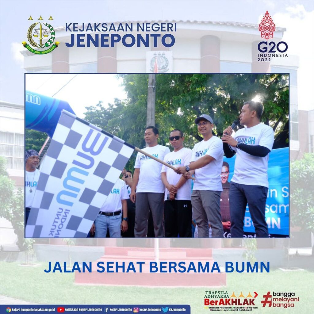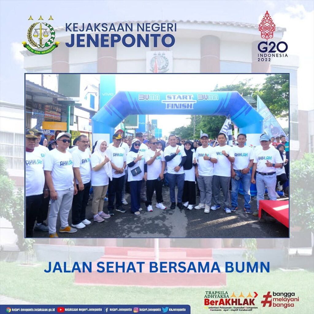 Minggu, 19 Maret 2023, pukul 07.30 Wita, Bertempat dilapangan PASTUR kab. Jeneponto, Mengikuti acara jalan sehat dengan tema ” Bersama BUMN menuju Indonesia Sehat ” dalam rangka memperingati HUT Kementrian BUMN ke 25 Tahun, kegiatan dihadiri oleh : 1. Wakil bupati jeneponto yang membuka acara jalan sehat; 2. Ketua DPRD; 3. SEKDA kab.Jeneponto; 4. Kapolres jeneponto 5. Jaksa Fungsional Irmawati Amir mewakili Kajari; 5. Mewakili Dandim 1425 kab.Jeneponto 6. Kepala OPD SE Kab. Jeneponto.