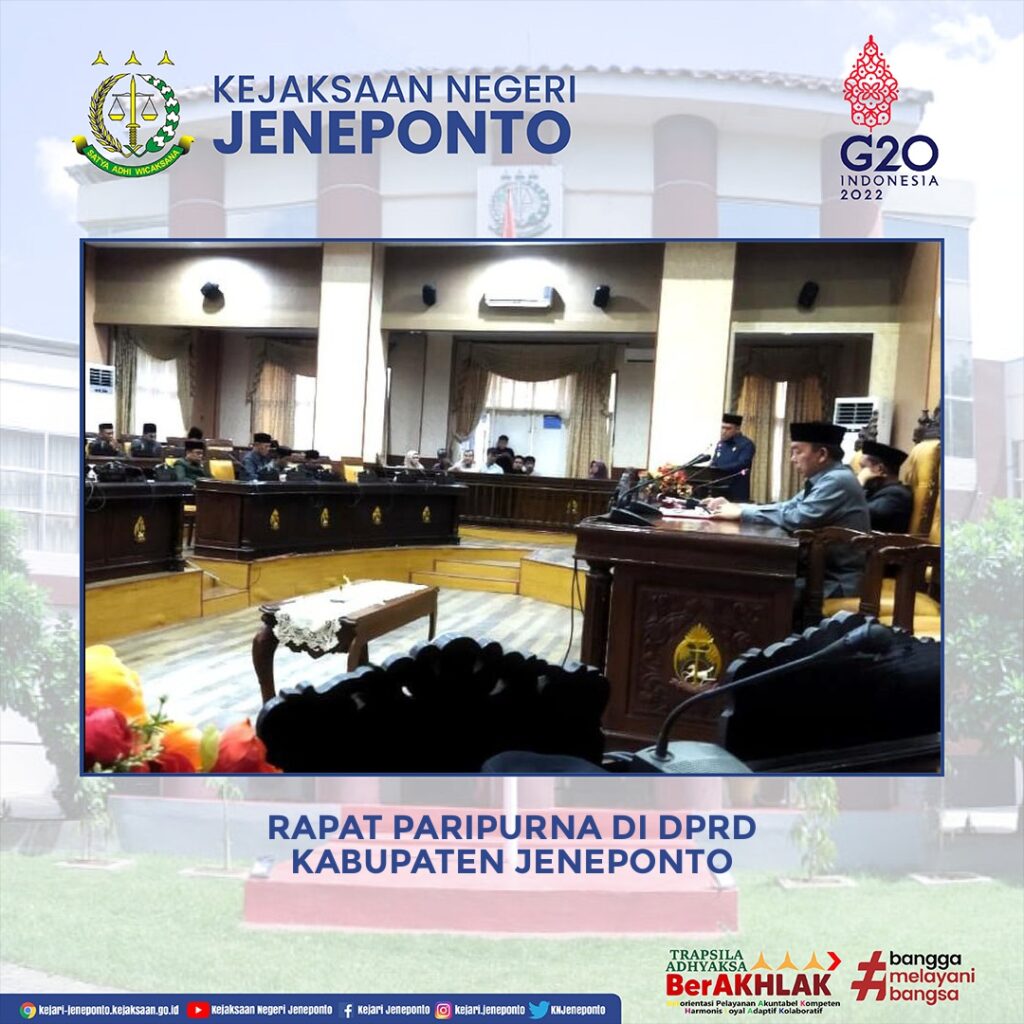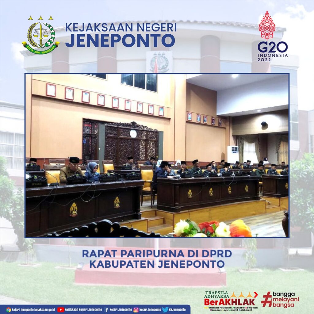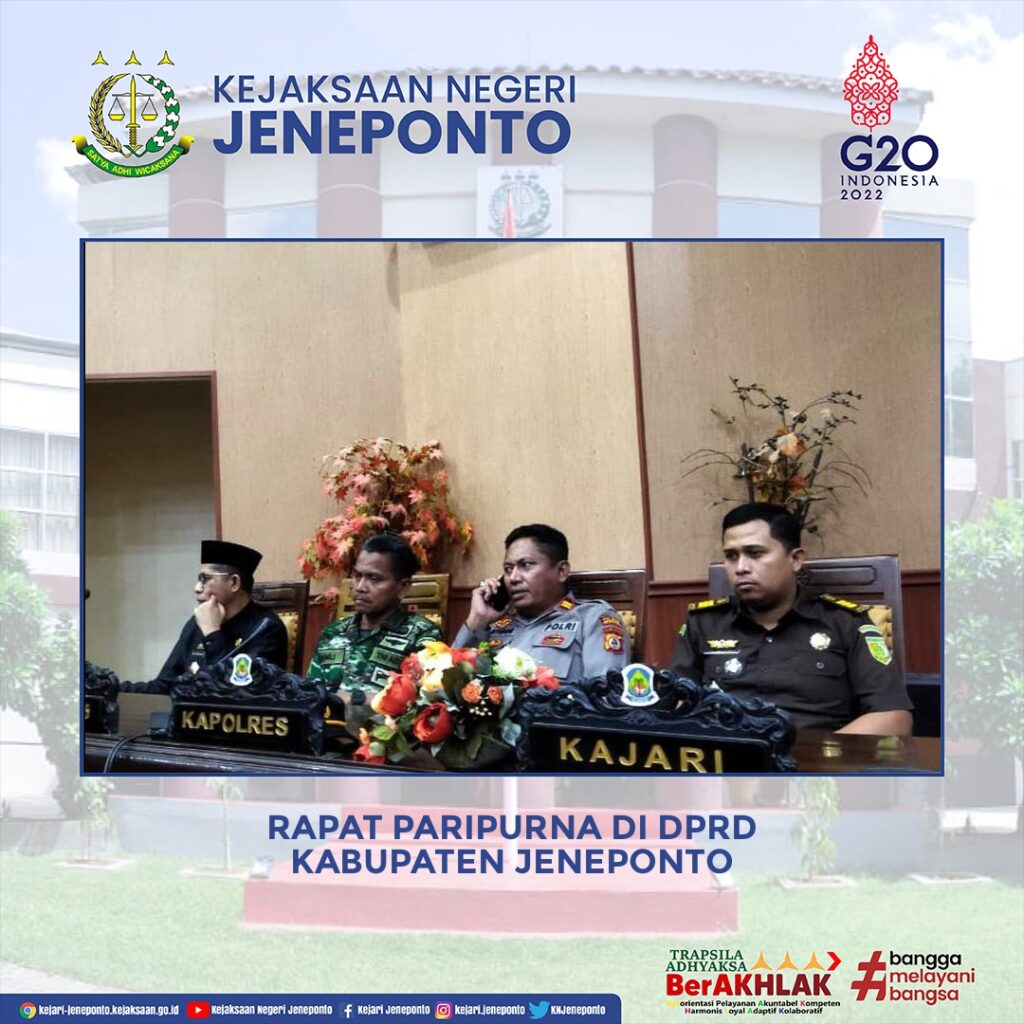 Jumat, 31 Maret 2023 Kepala Seksi PB3R Tiar Adi Riyanto, S.H. Mewakili Kepala Kejaksaan Negeri Jeneponto Menghadiri Rapat Paripurna DPRD Kab.Jeneponto dalam rangka Penyerahan Draft Laporang Keterangan Pertanggung Jawaban (LKPJ) Bupati Tahun Anggaran 2022 bertempat di Ruang Sidang Paripurna DPRD Kab. Jeneponto
