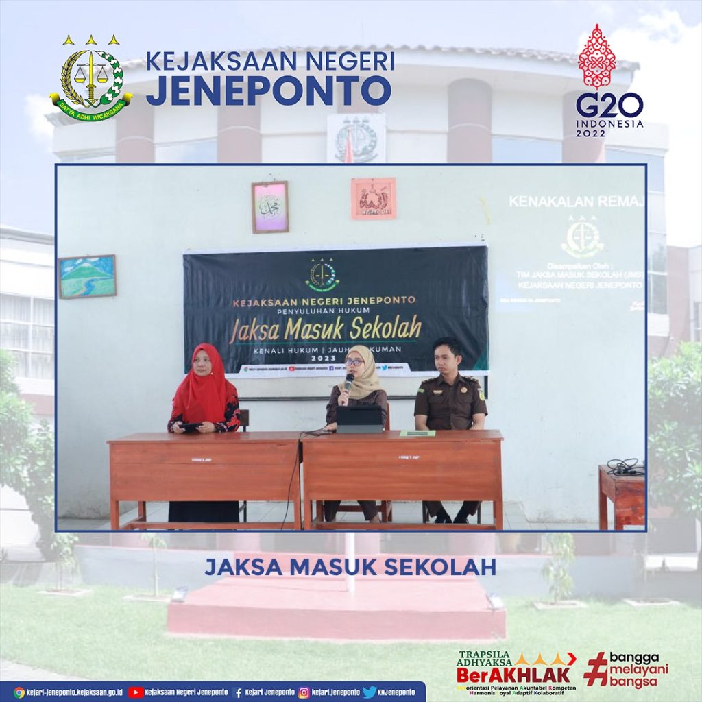 Bahwa Narasumber dalam kegiatan JMS adalah Syafaattul Kholifah, S.H. dan Sainuddin, S.H. membawakan Materi tentang Kenakalan Remaja serta Pengenalan Institusi Kejaksaan Republik Indonesia,