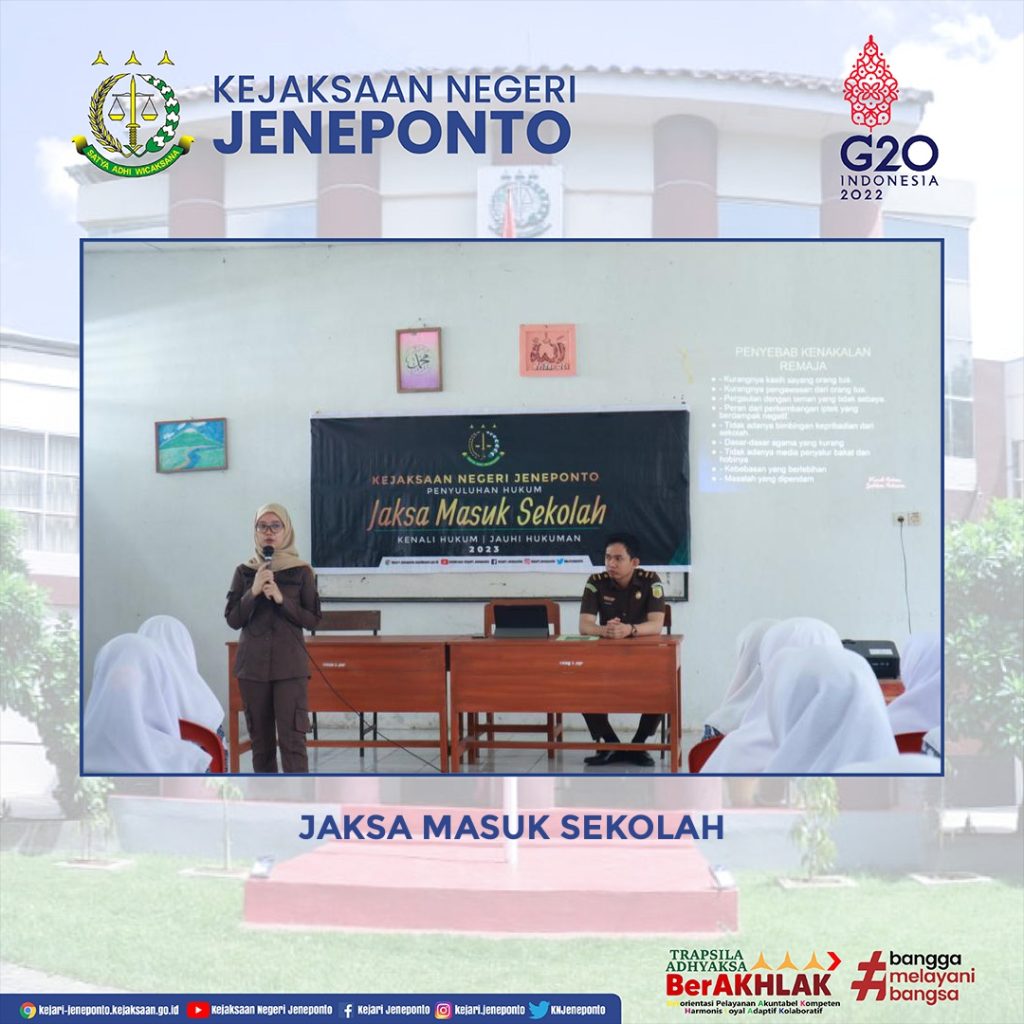 Telah dilaksanakan Kegiatan Jaksa Masuk Sekolah Oleh Bidang Intelijen Kejaksaan Negeri Jeneponto dengan tema “KENALI HUKUM JAUHI HUKUMAN” untuk siswa SMA Negeri 03 Jeneponto bertempat di salah satu kelas siswa SMA Negeri 03 Jeneponto.
