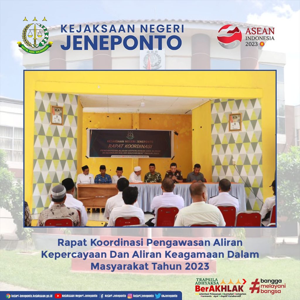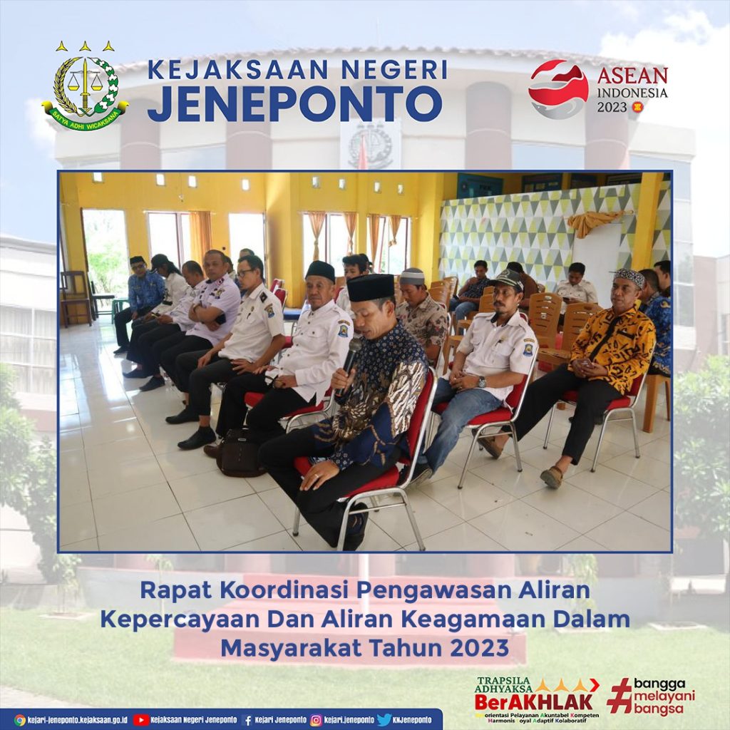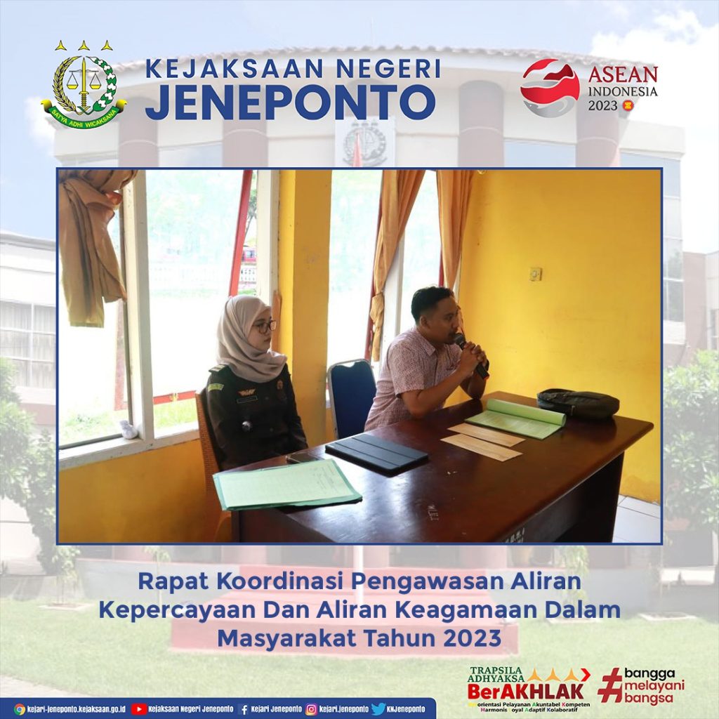 Telah dilaksanakan Rapat Koordinasi Pengawasan Aliran Kepercayaan Dan Aliran Keagamaan Dalam Masyarakat Tahun 2023 bertempat di Kantor Camat Bangkala dan Kegiatan tersebut dibuka oleh Kepala Kejaksaan Negeri Jeneponto.