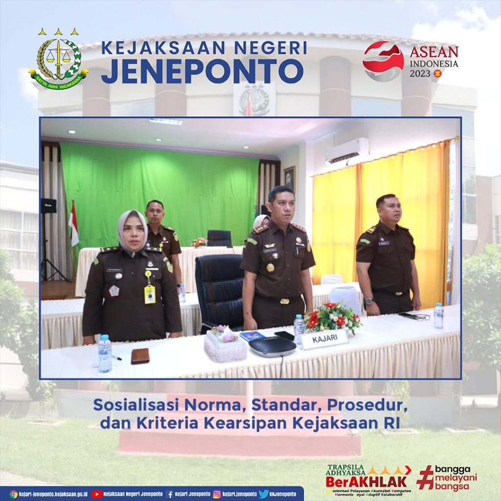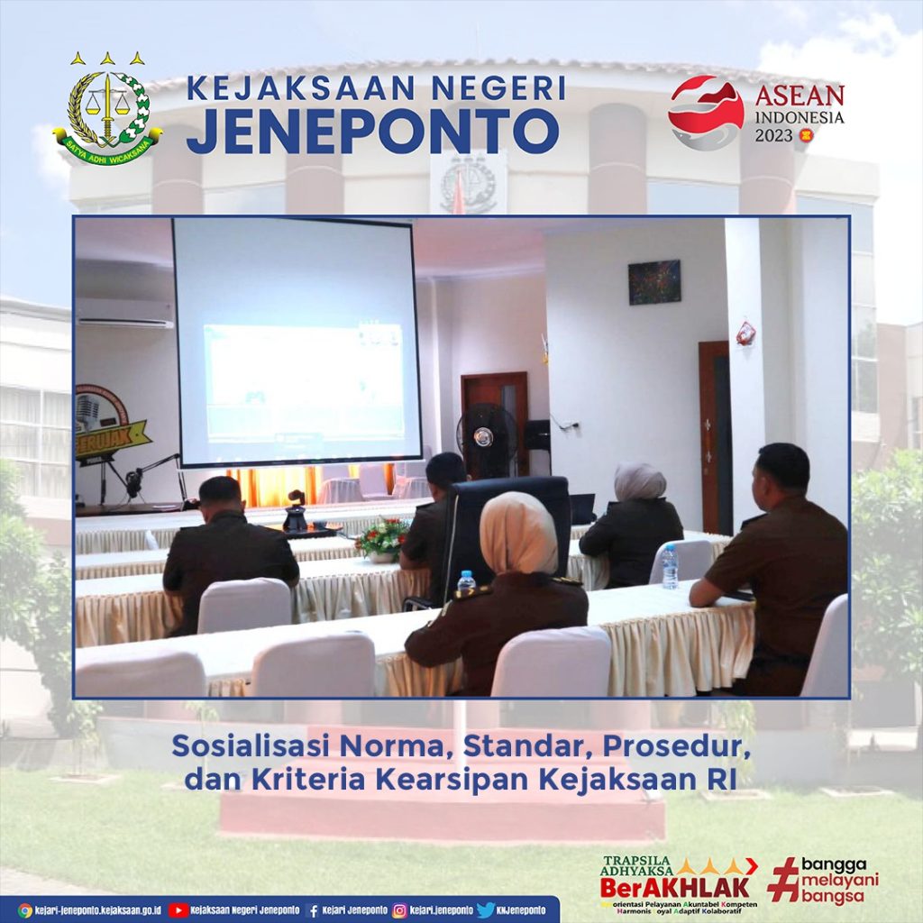 Telah dilaksanakan Sosialisasi Norma, Standar, Prosedur, dan Kriteria Kearsipan Kejaksaan RI secara virtual melalui Zoom Meeting bertempat di Aula Kejaksaan Negeri Jeneponto.