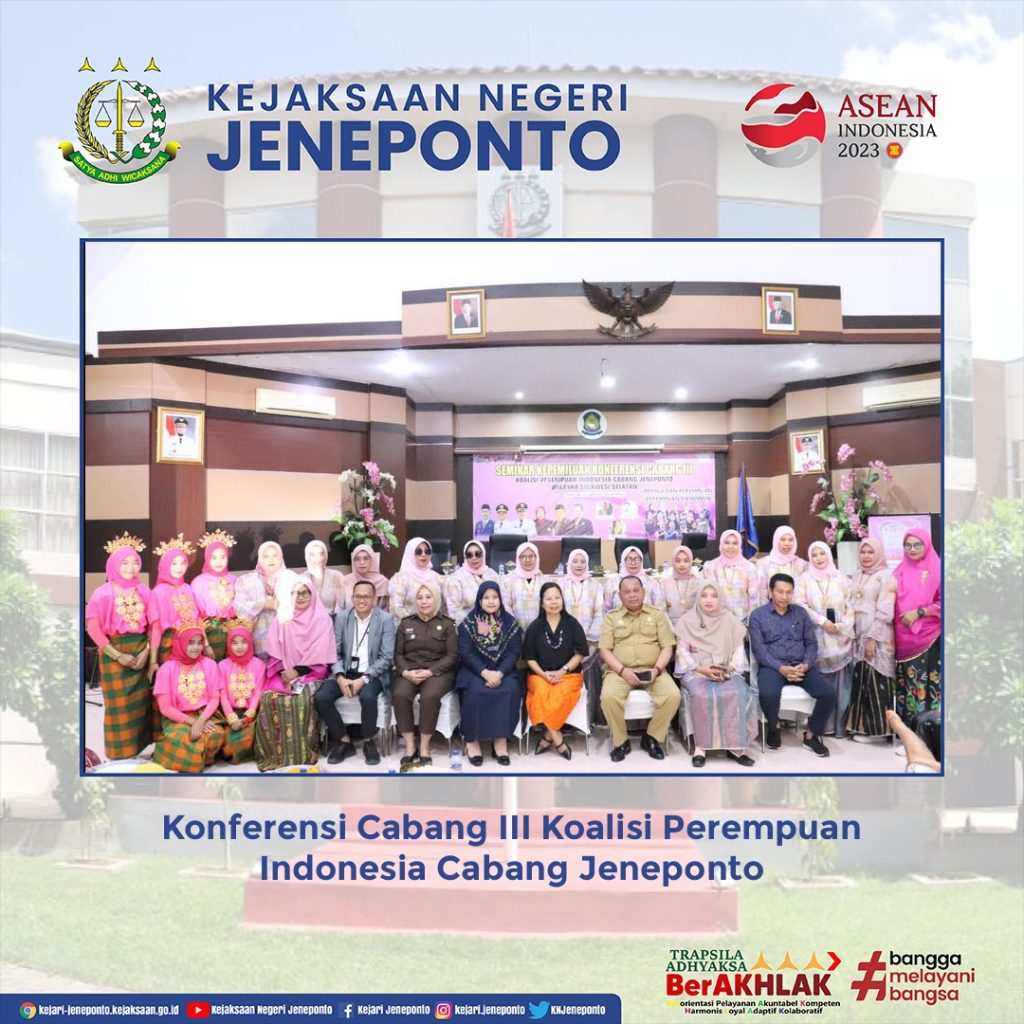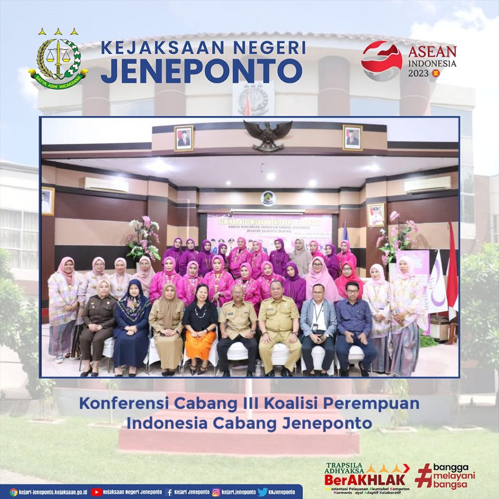 Bertempat di Ruang Kalabbirang (Rujab) Bupati Jeneponto, Kepala Kejaksaan Negeri Jeneponto yg diwakili oleh Jaksa Fungsional IRMAWATI AMIR, S.H., M.H. menghadiri acara Konverensi Cabang III Koalisi Perempuan Indonesia Cabang Jeneponto. kegiatan ini dihadiri oleh: