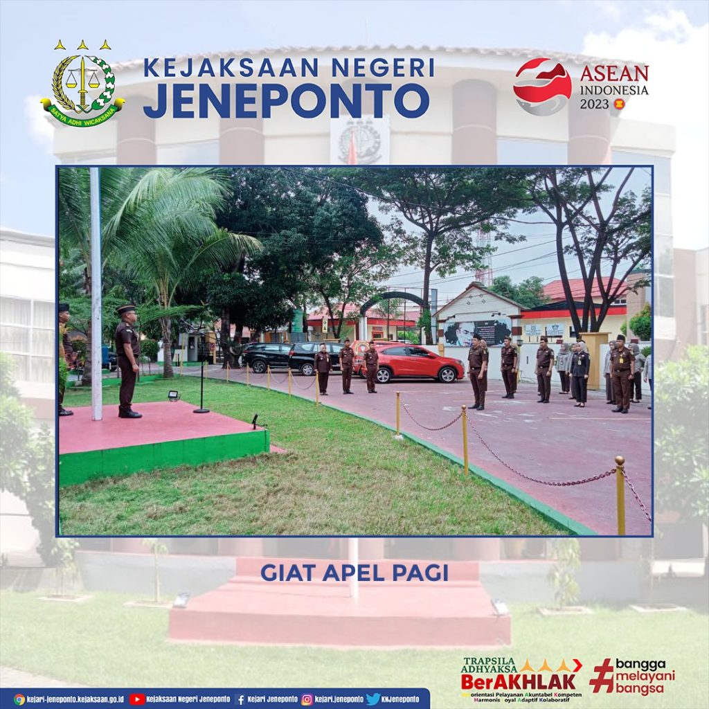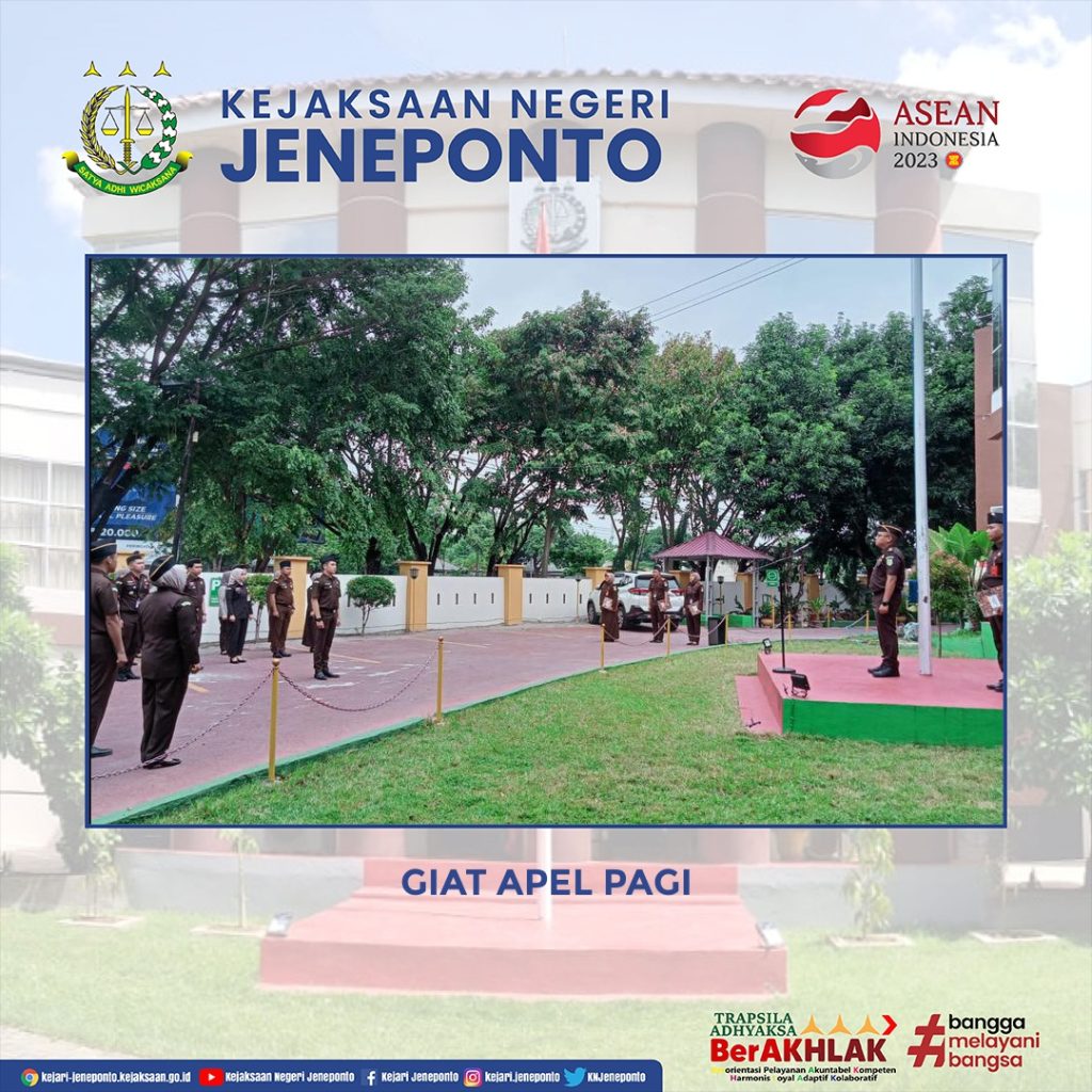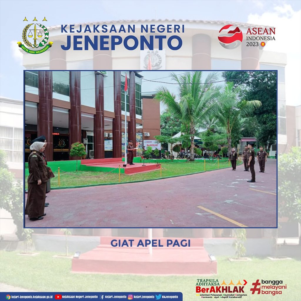 Kejaksaan Negeri Jeneponto melaksanakan Apel Pagi. Apel tersebut di pimpin langsung oleh Kepala Seksi Tindak Pidana Umum Zainal Abidin Salampessy, S.H., M.H dan diikuti oleh Para Kasi, Jaksa Fungsional, Pegawai serta PPNPN.
