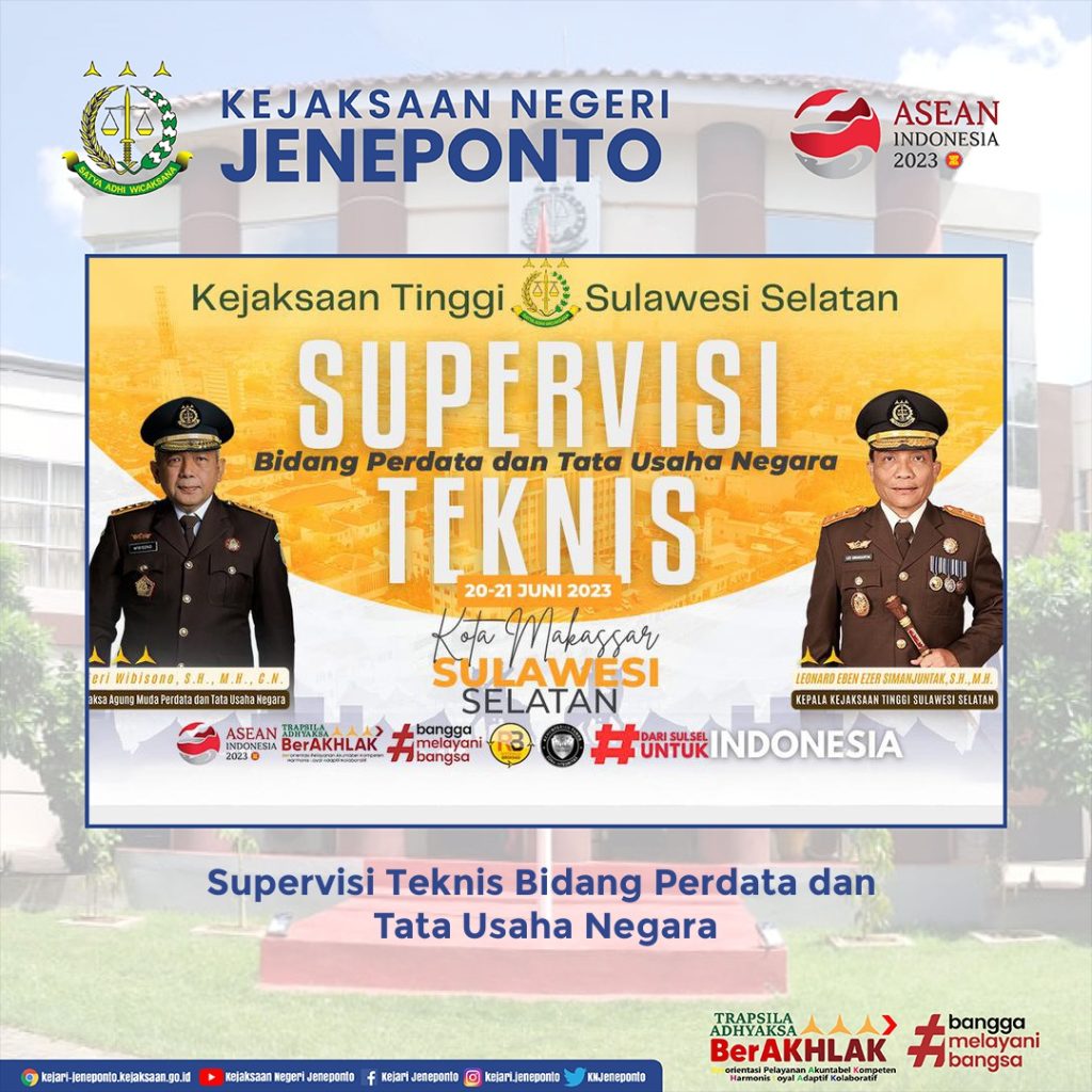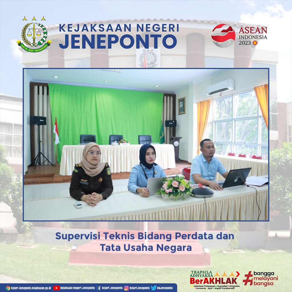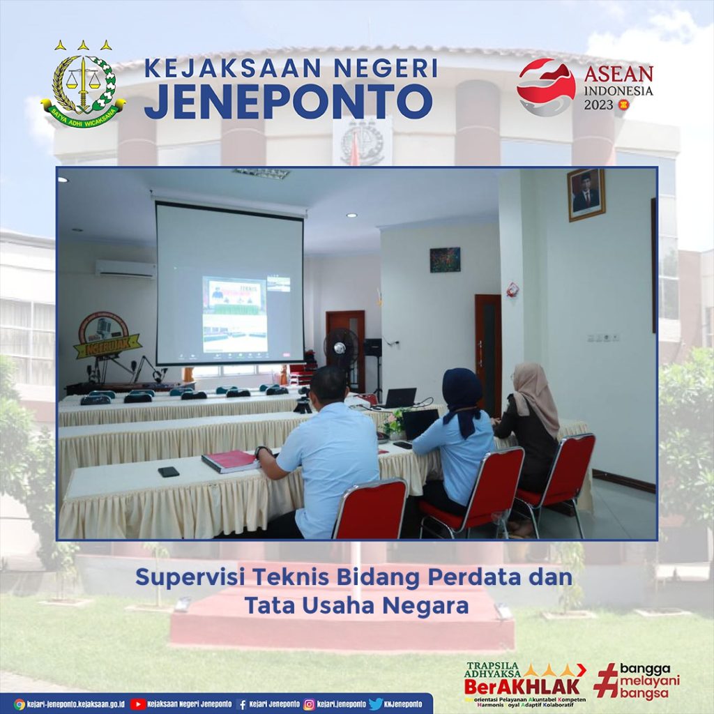 Telah dilaksanakan Supervisi Teknis Bidang Perdata dan Tata Usaha Negara oleh Jaksa Agung Muda Perdata dan Tata Usaha Negara secara virtual melalui Zoom Meeting bertempat di Aula Kejaksaan Negeri Jeneponto.