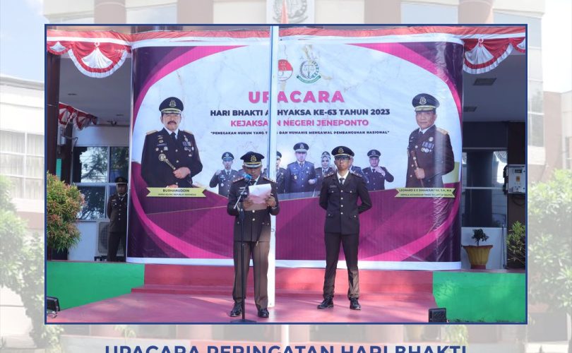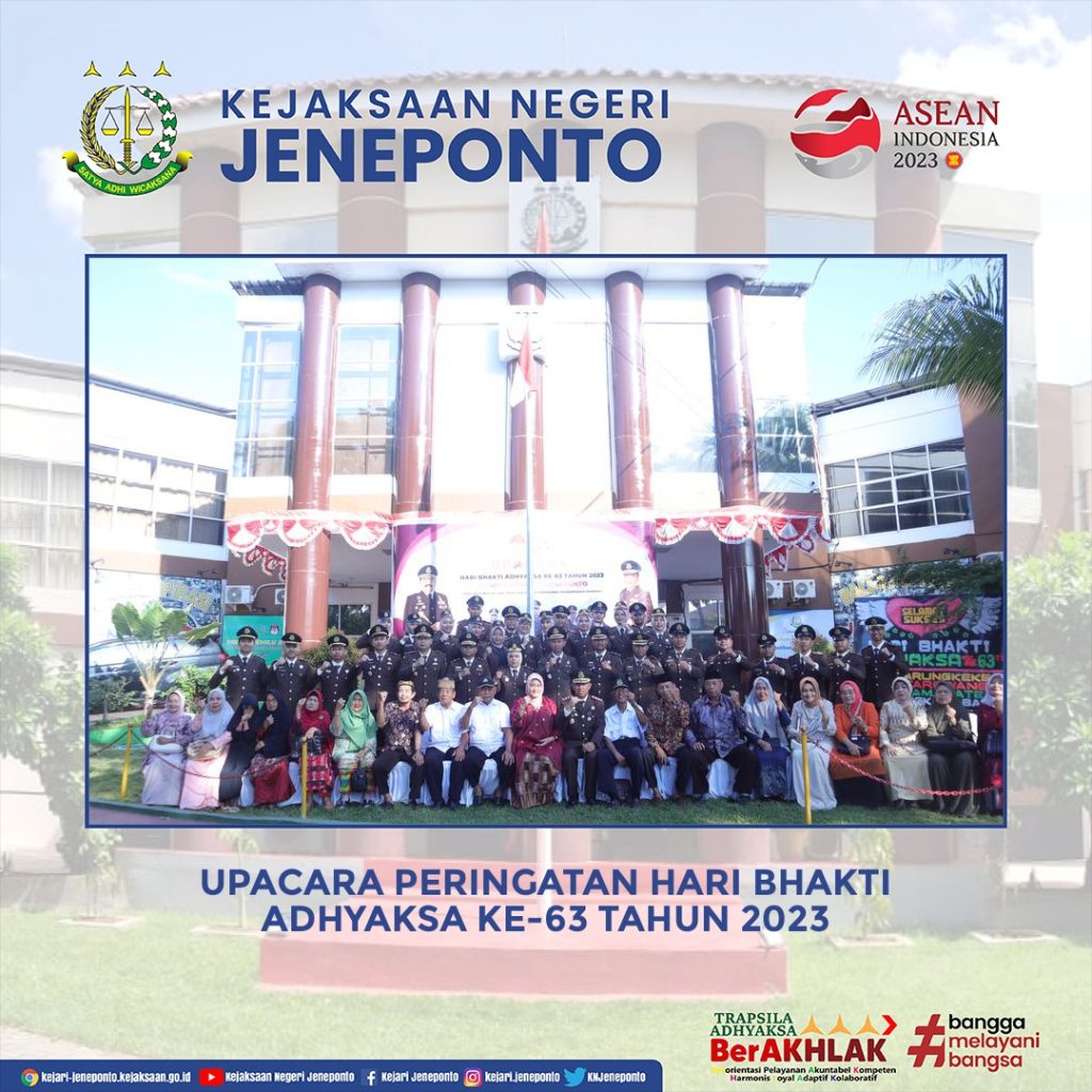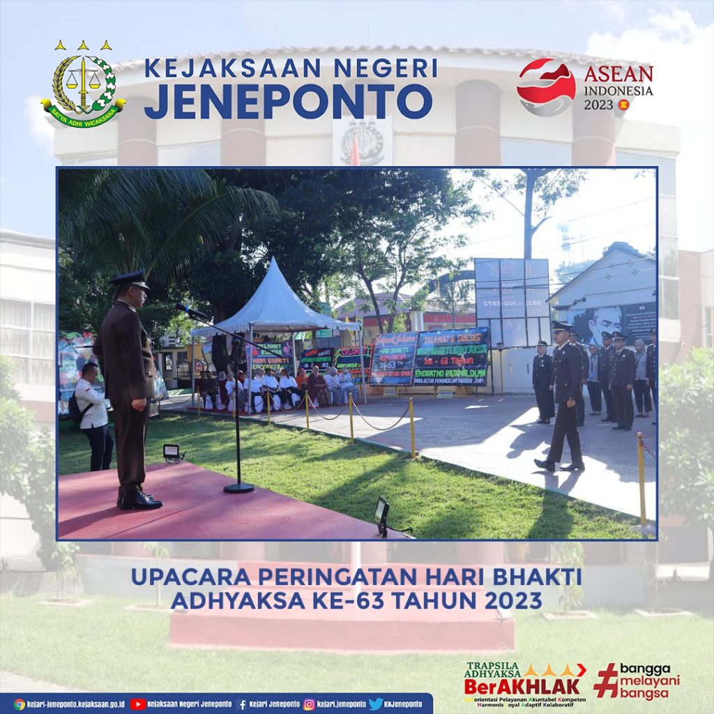 Kejaksaan Negeri Jenponto melaksanakan kegiatan Upacara dalam rangka memperingati Hari Bhakti Adhyaksa ke-63 Tahun 2023. Kegiatan ini dipimpin langsung oleh Kepala Kejaksaan Negeri Jeneponto Bapak Susanto Gani, S.H. dan diikuti oleh seluruh Pegawai Kejaksaan Negeri Jeneponto, kemudian dilanjutkan dengan upacara secara virtual langsung dari Balai Pendidikan & Pelatihan Kejaksaan Agung R.I., Jakarta.