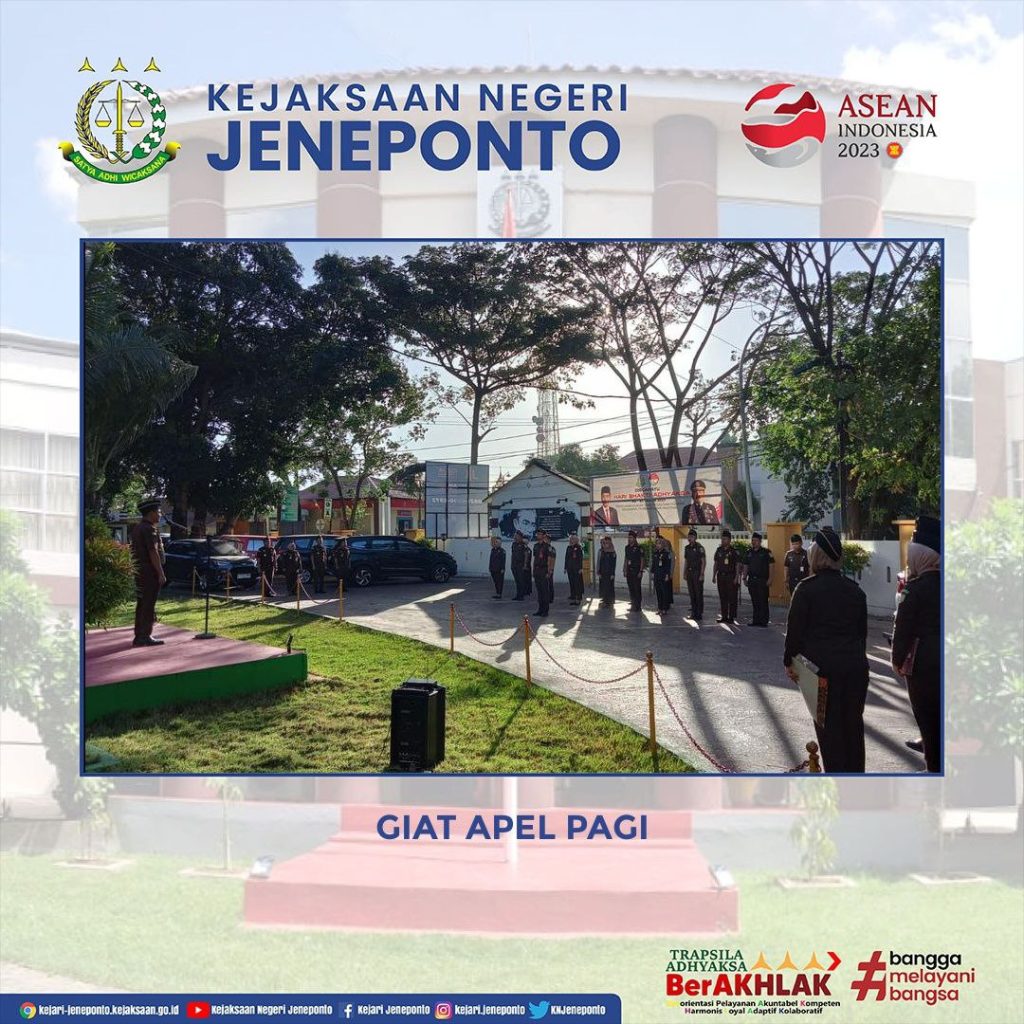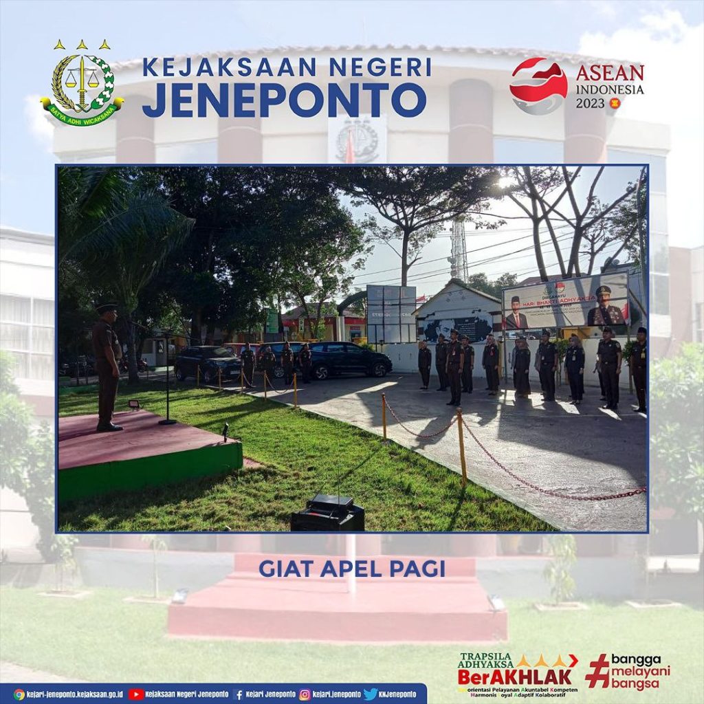 Kejaksaan Negeri Jeneponto melaksanakan Apel Pagi. Apel tersebut di pimpin langsung oleh Kepala Seksi Intelijen Bapak Hendarta, S.H., M.H. dan diikuti oleh Para Kasi, Jaksa Fungsional, Pegawai serta PPNPN.