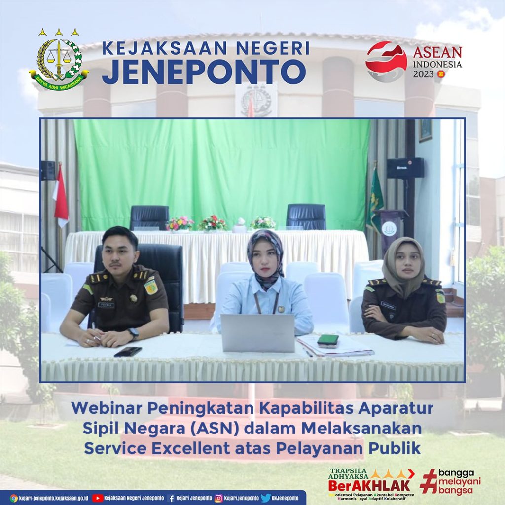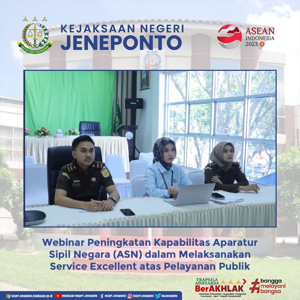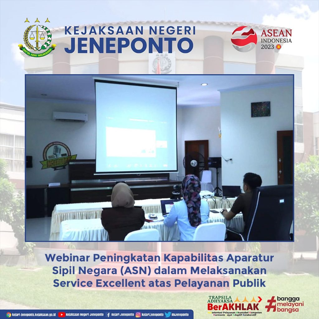 Telah dilaksanakan Webinar Peningkatan Kapabilitas Aparatur Sipil Negara (ASN) dalam Melaksanakan Service Excellent atas Pelayanan Publik pada Satuan Kerja di Lingkungan Kejaksaan Republik Indonesia Tahun 2023secara virtual bertempat di Aula Kejaksaan Negeri Jeneponto.