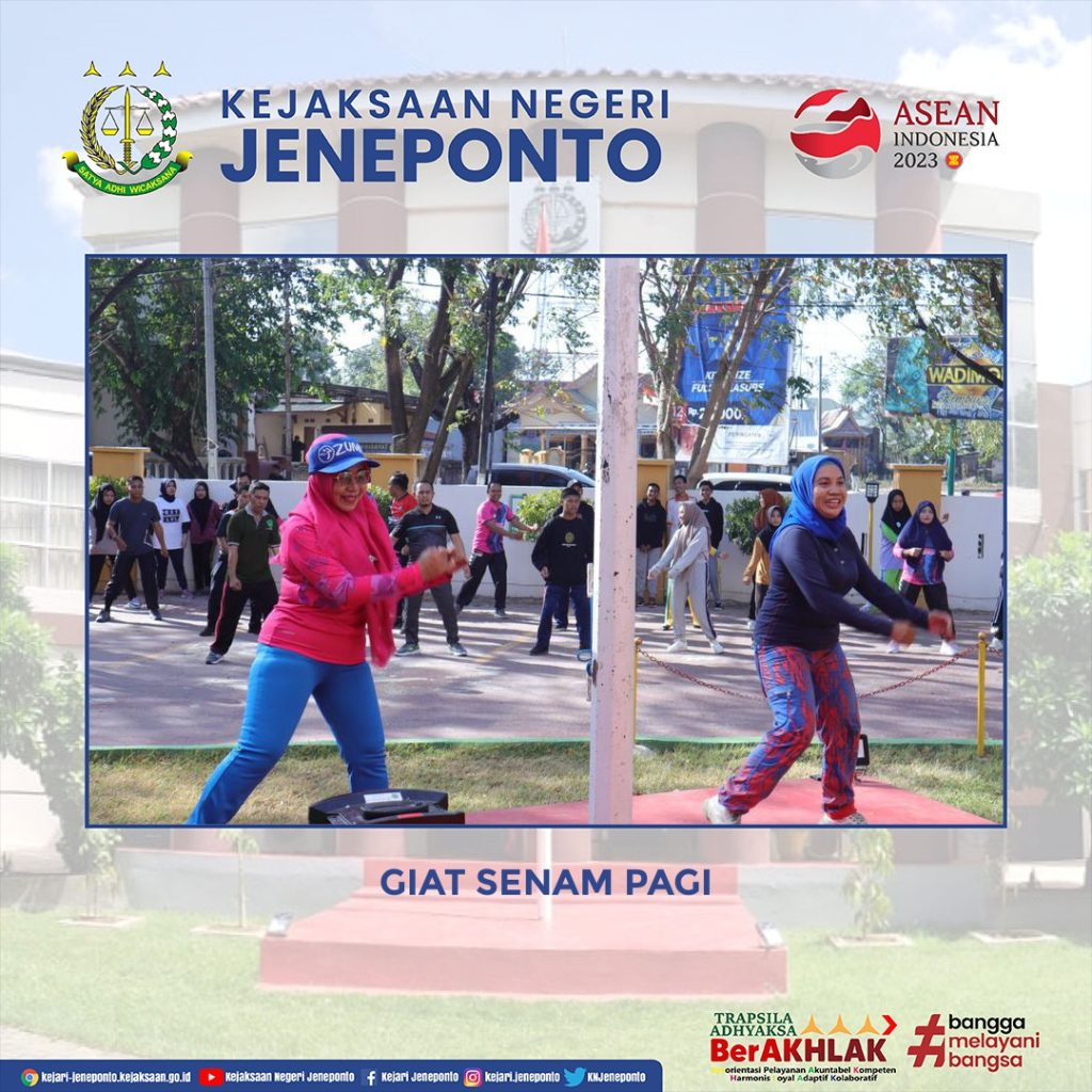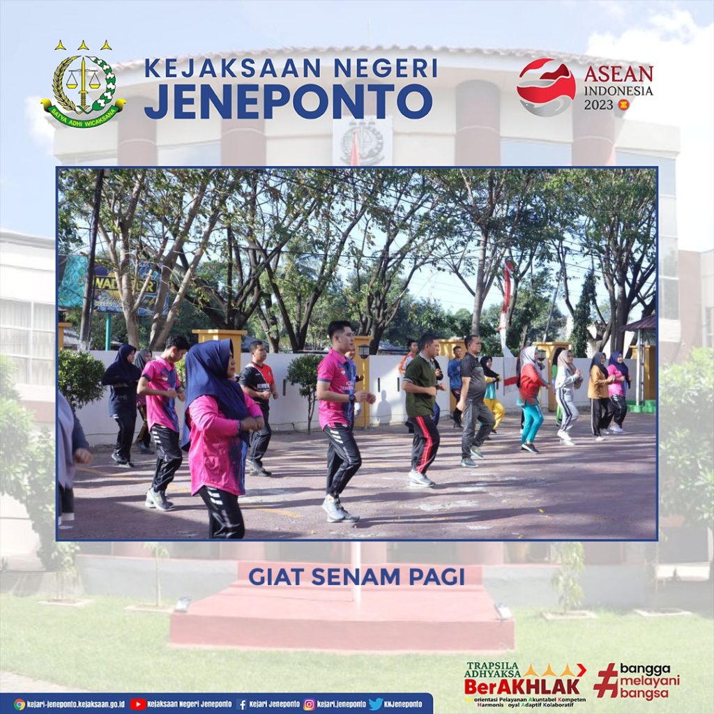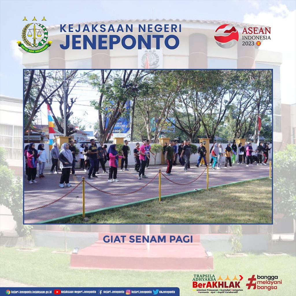 Kegiatan Senam Pagi Kejaksaan Negeri Jeneponto yang diikuti oleh Seluruh Pegawai, PPNPN,mahasiswa PPL dan siswa PKL bertempat di Halaman depan Kantor Kejaksaan Negeri Jeneponto.