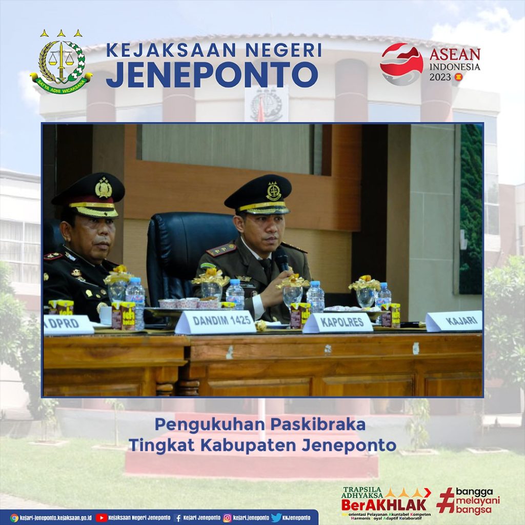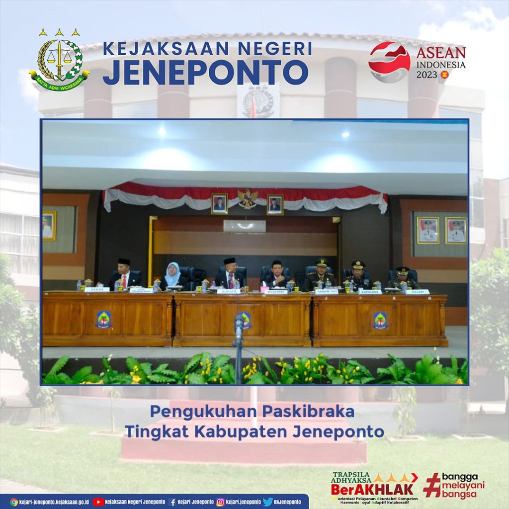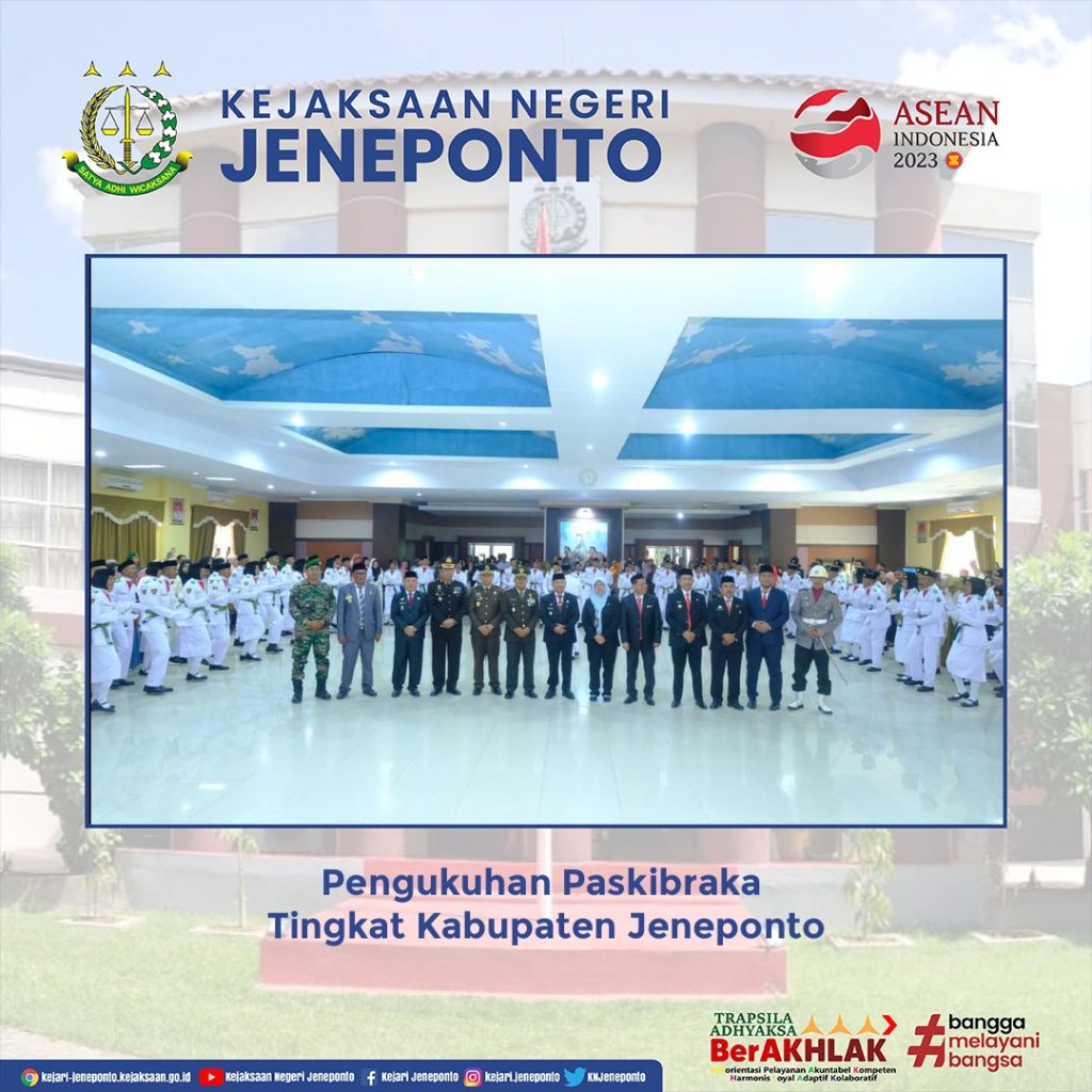 Kepala Kejaksaan Negeri Jeneponto menghadiri Kegiatan Pengukuhan Paskibraka Tingkat Kabupaten Jeneponto dalam rangka memeriahkan peringatan HUT Proklamasi kemerdekaan Republik Indonesia ke-78 Tahun 2023 bertempat di Ruang Pola Panrannuangta Kantor Bupati Jeneponto.