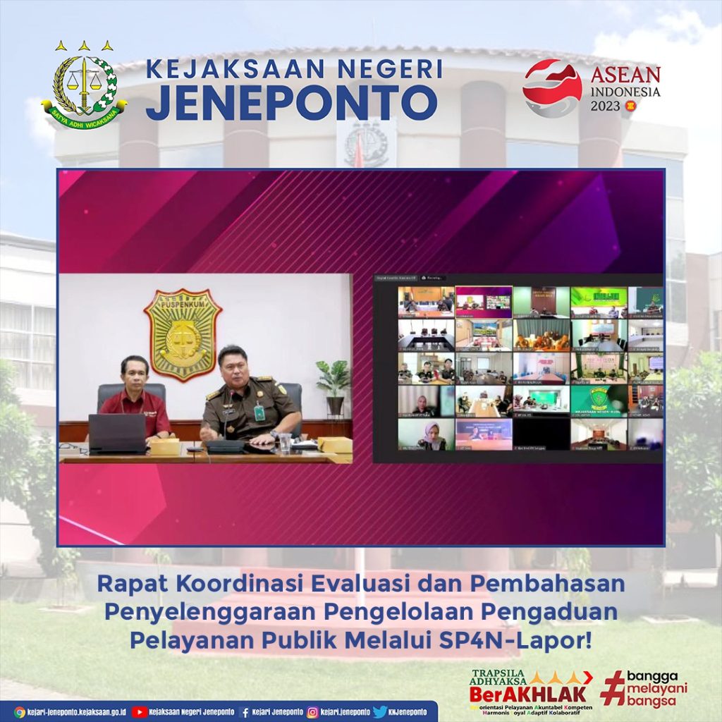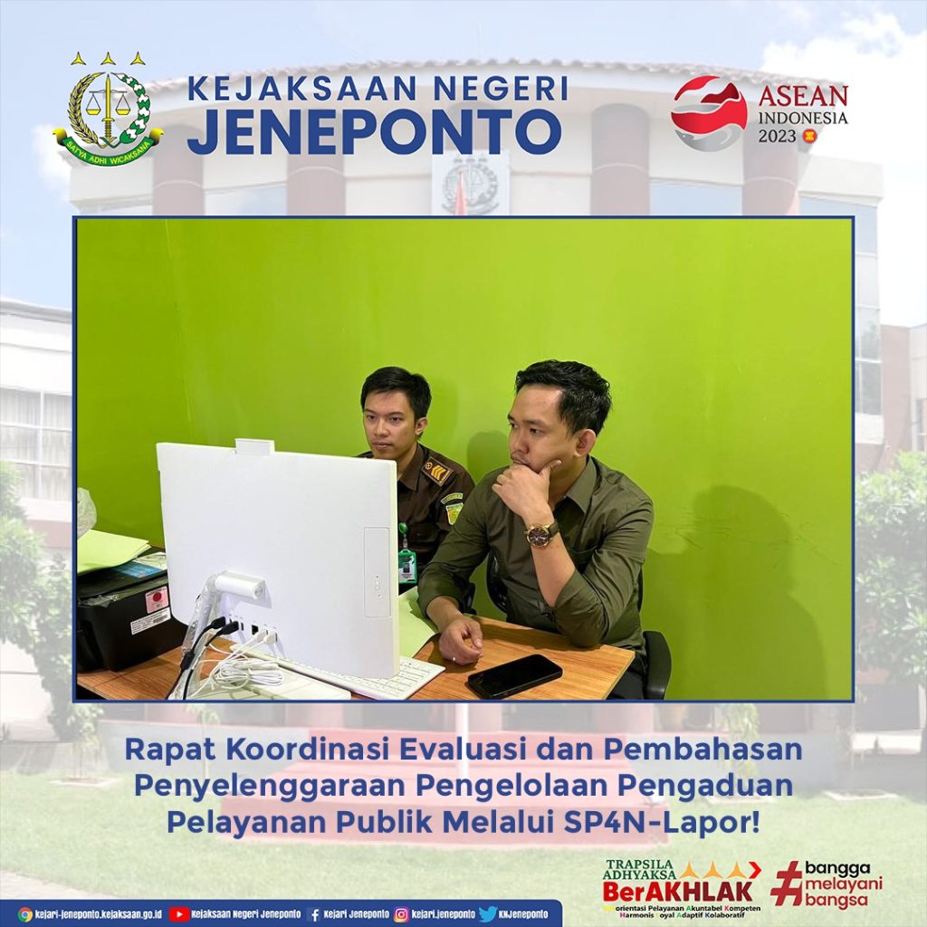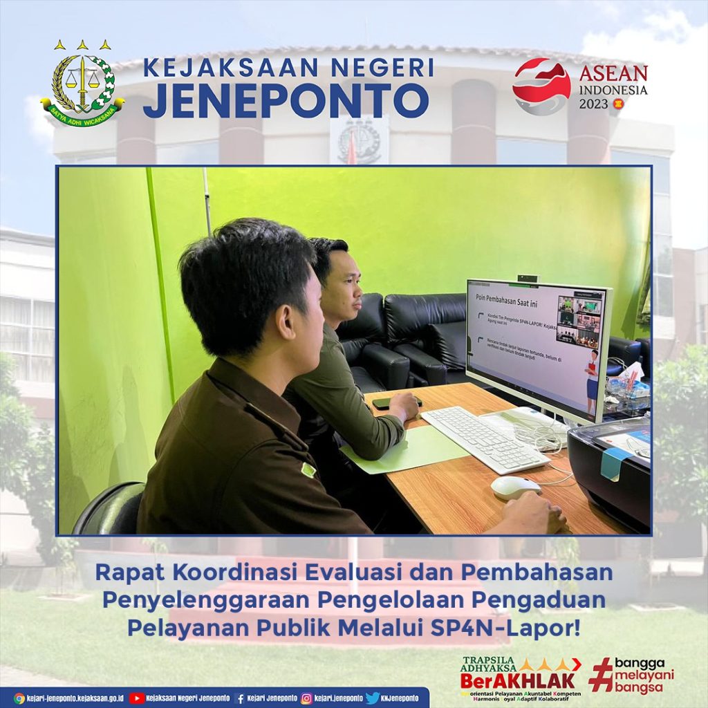 Jaksa Fungsional dan Staff Intelijen mengikuti Rapat Koordinasi Evaluasi dan Pembahasan Action Plan Penyelenggaraan Pengelolaan Pengaduan Pelayanan Publik Melalui SP4N-Lapor! di Lingkup Kejaksaan Agung yang diselenggarakan oleh Pusat Penerangan Hukum Kejaksaan Republik Indonesia secara virtual bertempat di Ruang Posko Pemilu Kejaksaan Negeri Jeneponto.