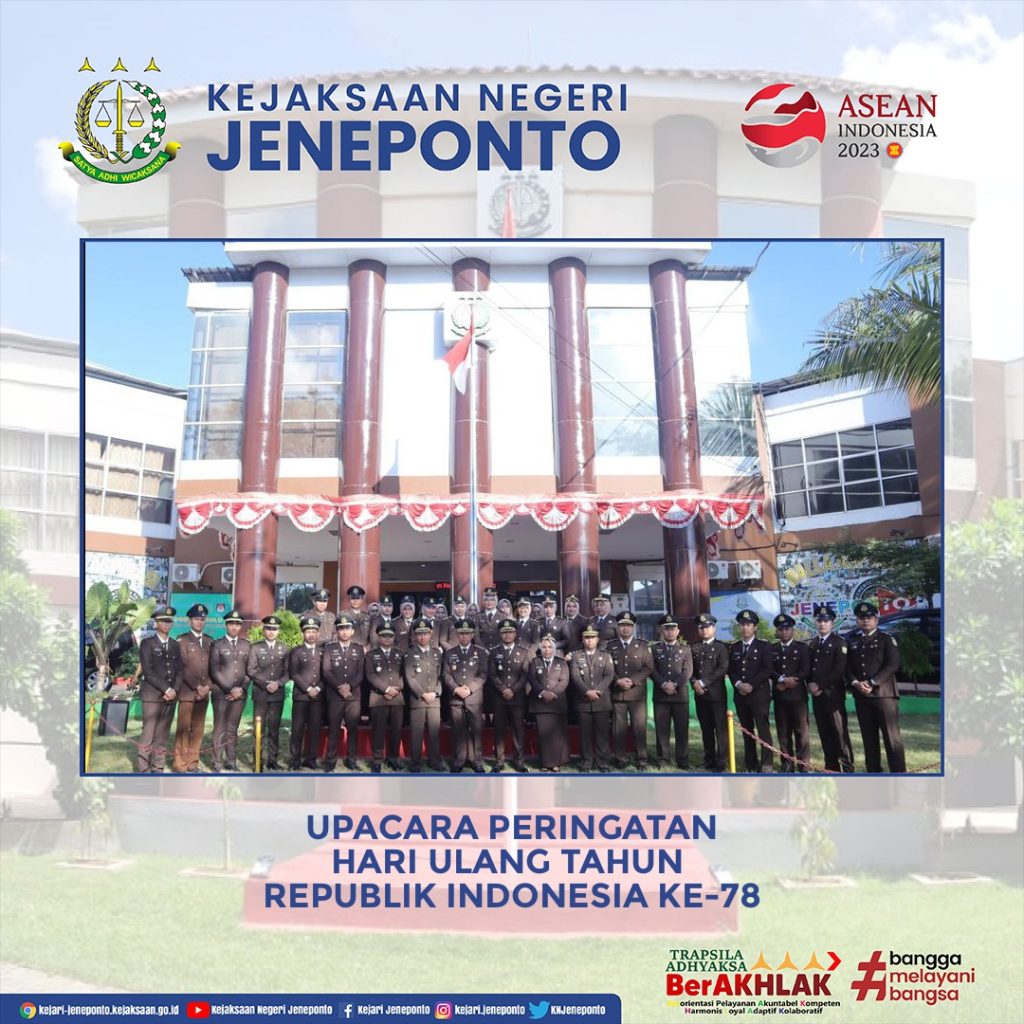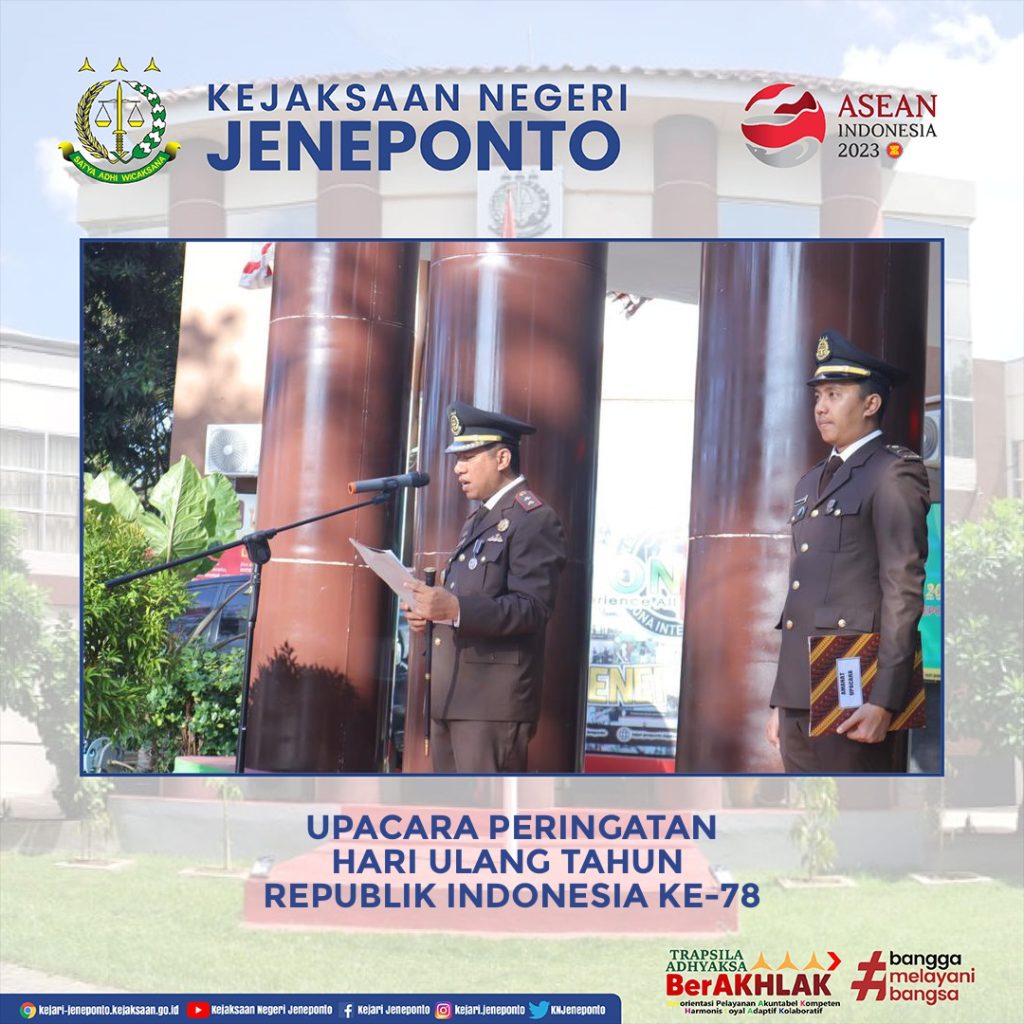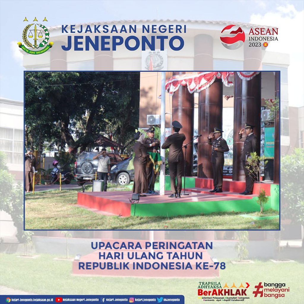 Kepala Kejaksaan Negeri Jeneponto, Susanto Gani, S.H., selaku Inspektur Upacara memimpin upacara peringatan Hari Ulang Tahun Republik Indonesia Ke-78 (17 Agustus 2023) di halaman Kantor Kejaksaan Negeri Jeneponto dan diikuti oleh seluruh jajaran Kejaksaan Negeri Jeneponto.