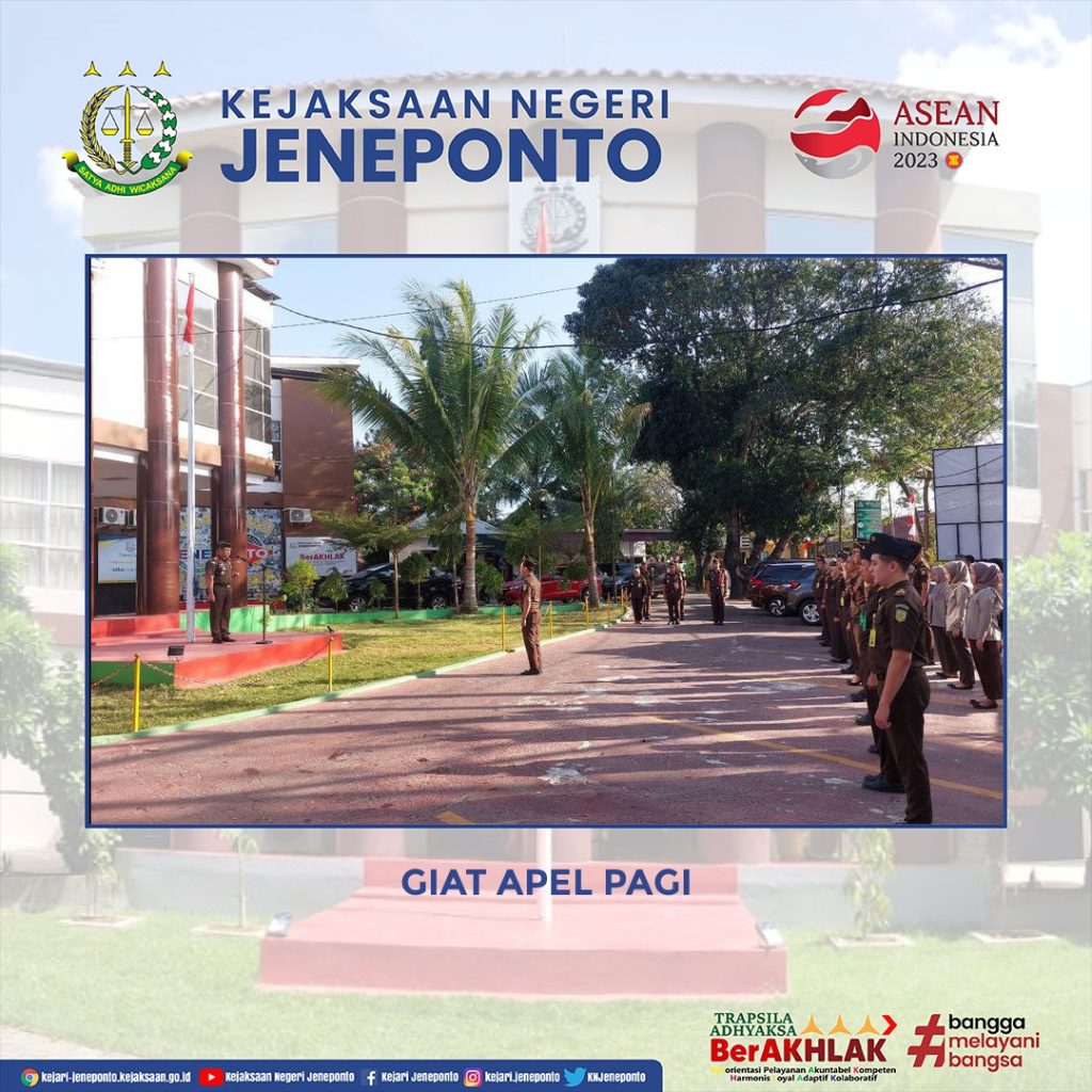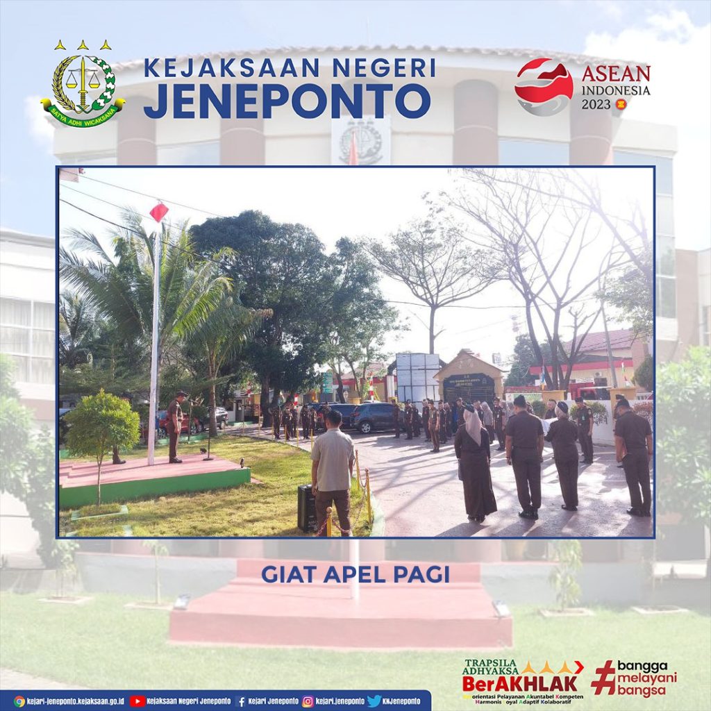 Kejaksaan Negeri Jeneponto melaksanakan Apel Pagi. Apel tersebut di pimpin langsung oleh Kepala Kejaksaan Negeri Jeneponto Bapak Susanto Gani, S.H. dan diikuti oleh Para Kasi,Kasubagbin, Jaksa Fungsional dan Pegawai serta PPNPN.