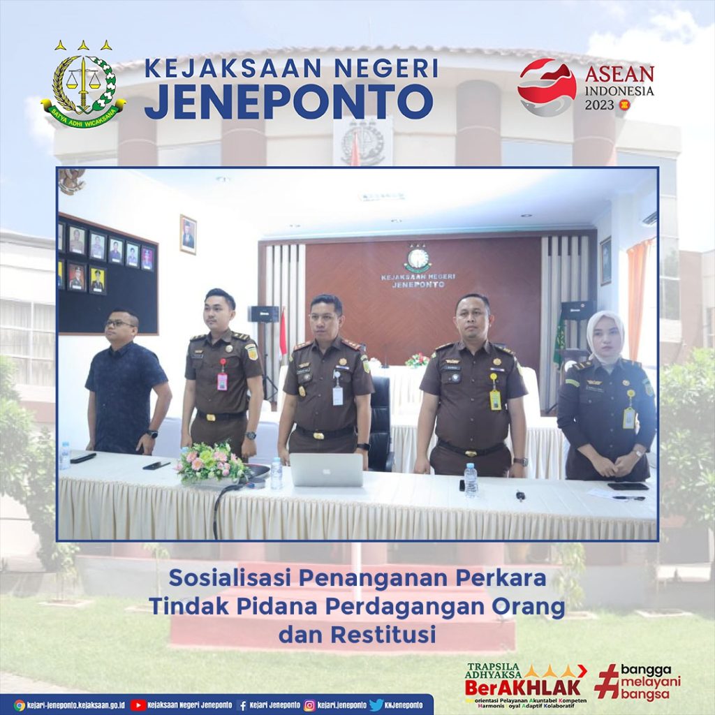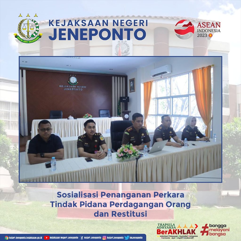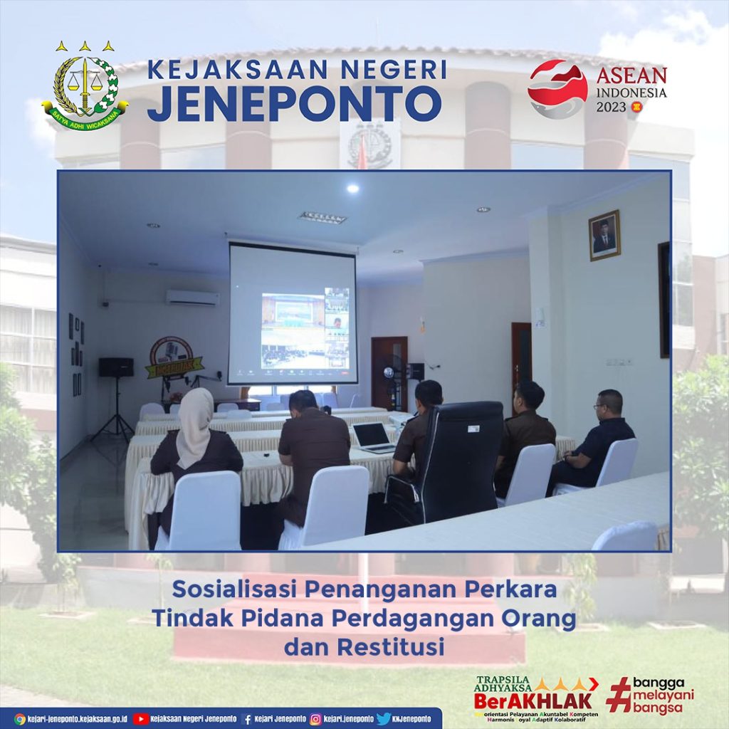 Telah dilaksanakan Sosialisasi Penanganan Perkara Tindak Pidana Perdagangan Orang dan Restitusi secara virtual melalui Zoom Meeting bertempat di Aula Kejaksaan Negeri Jeneponto.