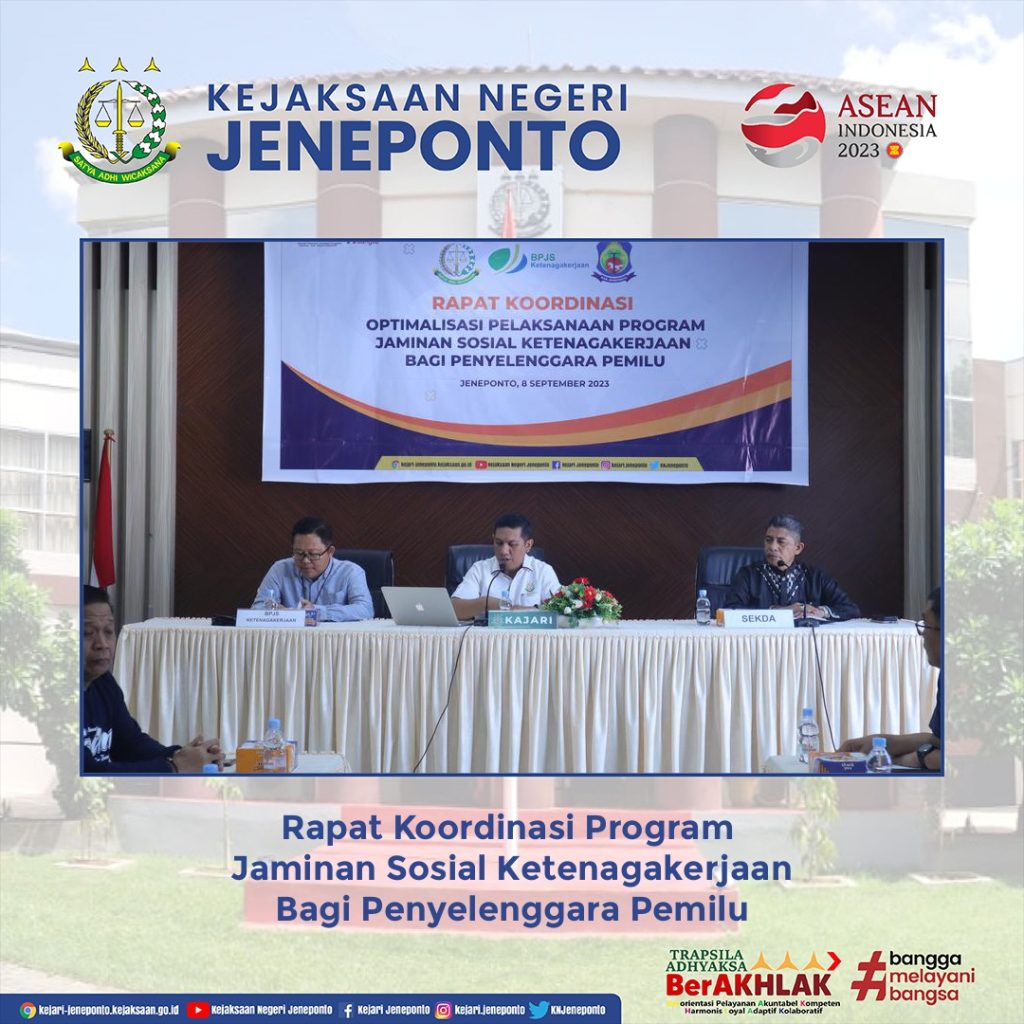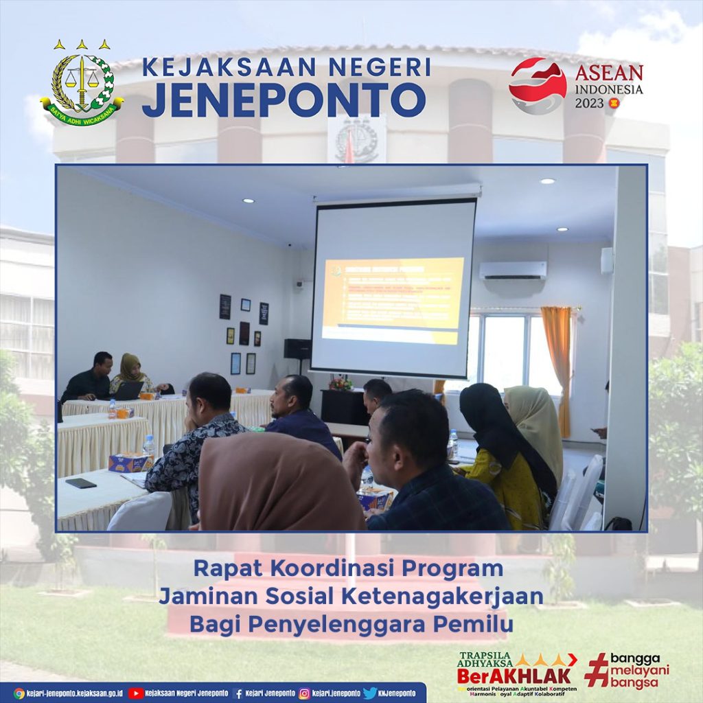 Telah dilaksanakan Rapat Koordinasi Optimalisasi Pelaksanaan Program Jaminan Sosial Ketenagakerjaan Bagi Penyelenggara Pemilu bertempat di Aula Kejaksaan Negeri Jeneponto.