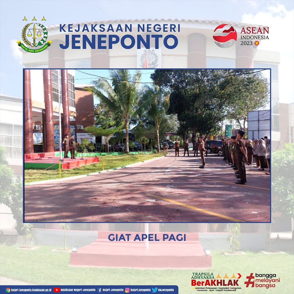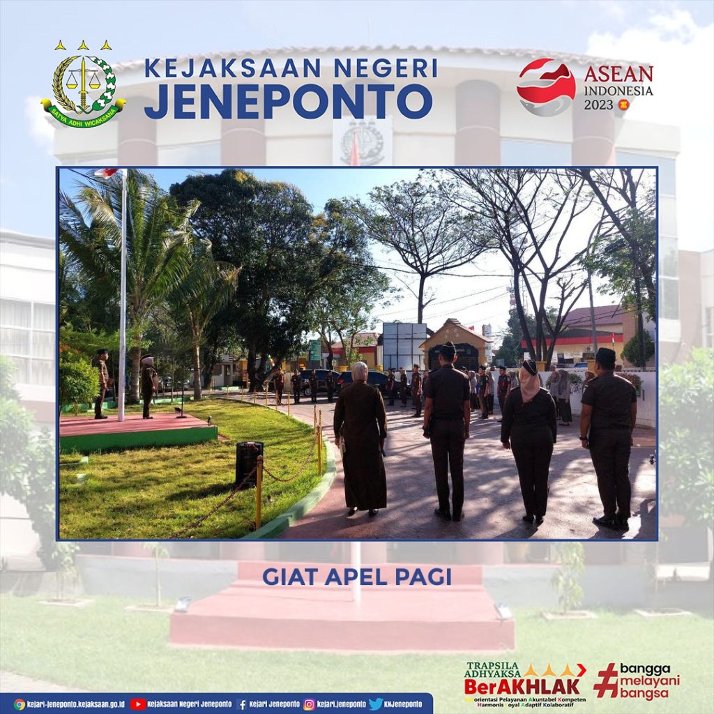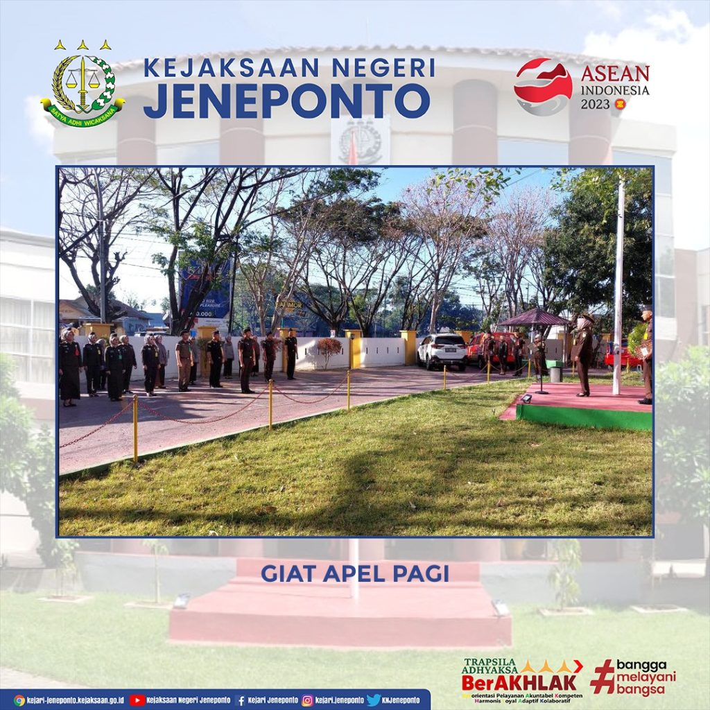 Kejaksaan Negeri Jeneponto melaksanakan Apel Pagi. Apel tersebut di pimpin langsung oleh Kepala Sub Bagian Pembinaan Ivon Hadjrawati, S.H. dan diikuti oleh Para Kasi, Jaksa Fungsional, Pegawai serta PPNPN .