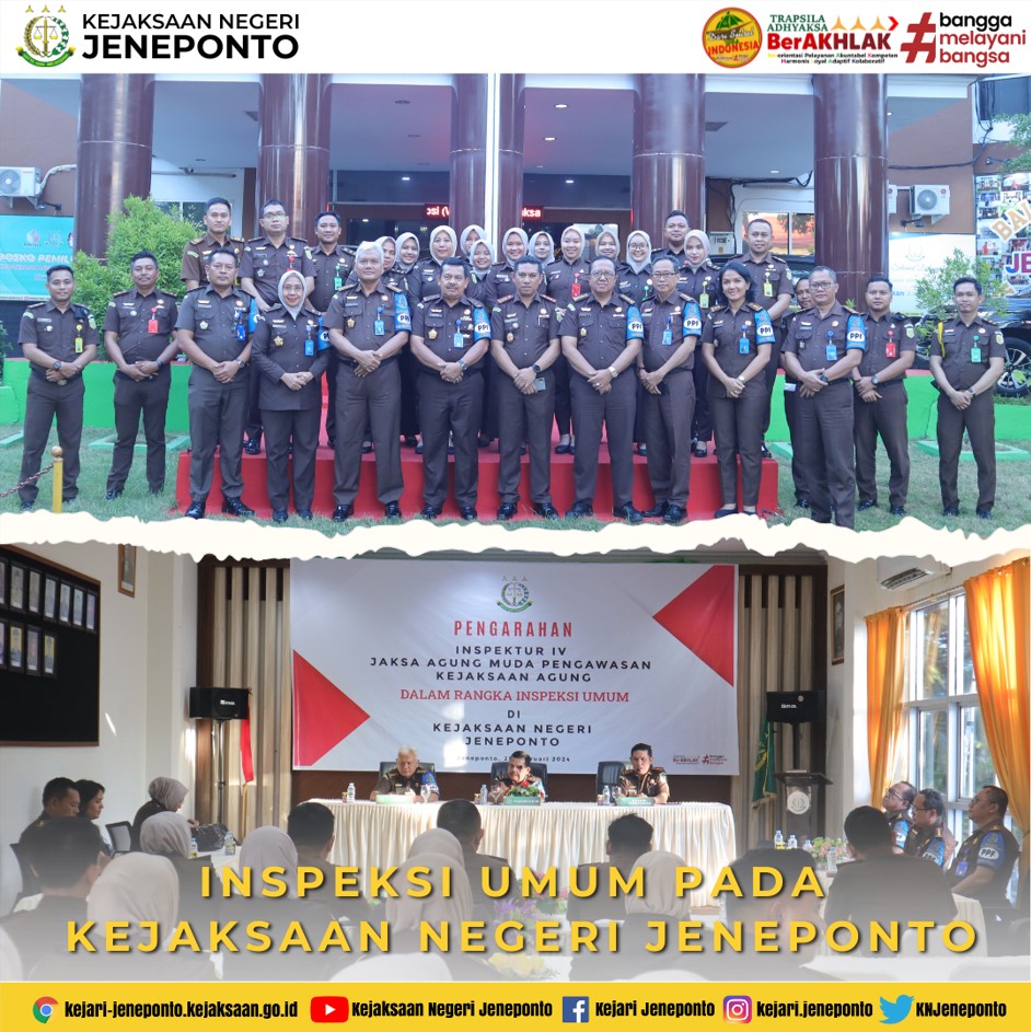 Bertempat di Kantor Kejaksaan Negeri Jenepoto, telah dilaksanakan giat Inspeksi Umum pada Satuan Kerja Kejaksaan Negeri Jeneponto oleh Bapak Edward Kaban, SH., ΜΗ. Inspektur IV pada Jaksa Agung Muda Bidang Pengawasan beserta Jajaran.